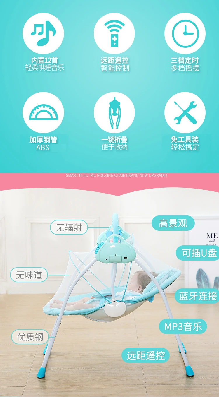 Материалы: персик (приятная для кожи ткань, Толстая стальная труба, краска для защиты окружающей среды, АБС-пластик Грузоподъемность: 18 кг В собранном виде: 20,7x27,5x10,2 В/52x70x85 см В сложенном виде: 20,7x34,6x12 дюймов/52x88x32 см Цвет: хаки, синий, розовый Применение: 0-18 месяцев Особенности: ● Кресло-качалка со съемным моющимся тканевым покрытием, ткань очень мягкая для защиты кожи ребенка. ● Подушка в комплекте помогает и корректирует уменьшение? На голове, обеспечивая красивую форму головы. ● Все колыбели WAGN TAO соответствуют или превышают текущие применимые стандарты безопасности для детских товаров. ● Безопасный фиксированный ремень предотвращает скалолазание ребенка, мягкая Нескользящая конструкция коврика для увеличения колыбели и трения земли для защиты стабильности и безопасности при тряске, держать качели стабильными. ● Это также естественная эргономика, которая позволяет ребенку свободно перемещать ноги и научиться ногами. ● Электрические качели, с музыкой, батареей, Bluetooth, пультом дистанционного управления, складывающимся, тканевым покрытием можно непосредственно снять и очистить. Безопасный, удобный, складной, съемный и без инструментов. ● Материал персика-приятная для кожи ткань, дышащая и впитывающая пот, универсальная в течение четырех сезонов. bsorbing, универсальная в течение четырех сезонов.