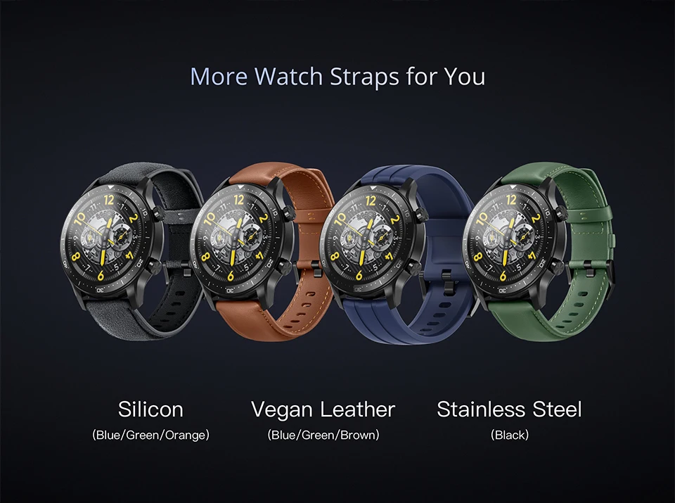 Кремний (синий/зеленый/оранжевый), веганская кожа (синий/зеленый/коричневый), нержавеющая сталь (черный)