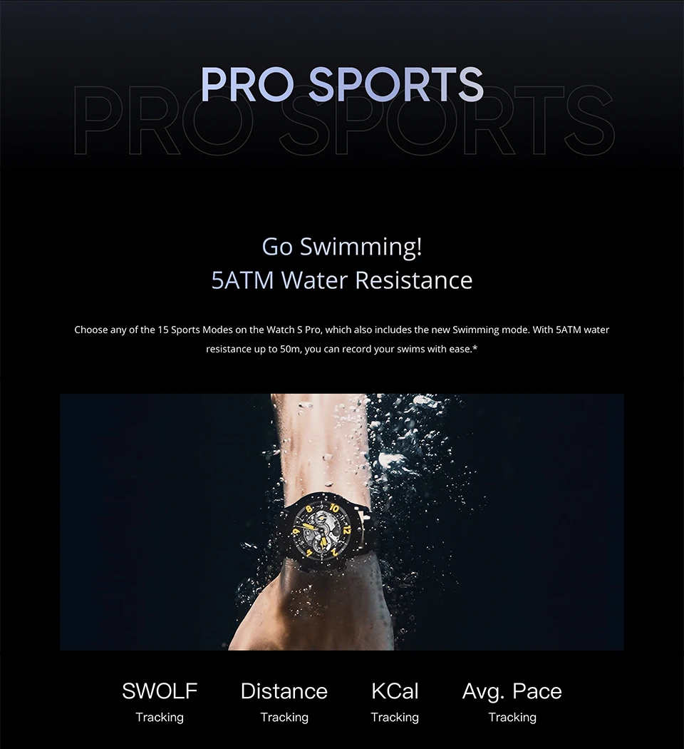 Выберите любой из 15 спортивных режимов на Watch S Pro, который также включает в себя новый режим плавания. С водонепроницаемостью 5 АТМ до 50 м, вы можете легко записывать ваши заплывы.