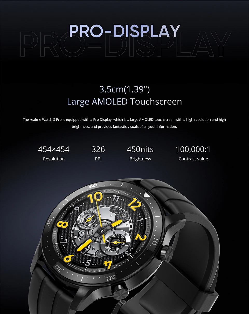 Часы realme Watch S Pro оснащены Pro дисплеем, который является большим AMOLED сенсорным экраном с высоким разрешением и высокой яркостью и обеспечивает фантастические визуальные эффекты всей вашей информации.
