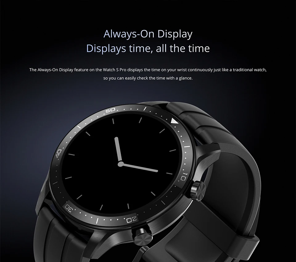 Функция всегда на дисплее часов S Pro показывает время на вашем запястье непрерывно так же, как традиционные часы, так что вы можете легко проверить время с первого взгляда.