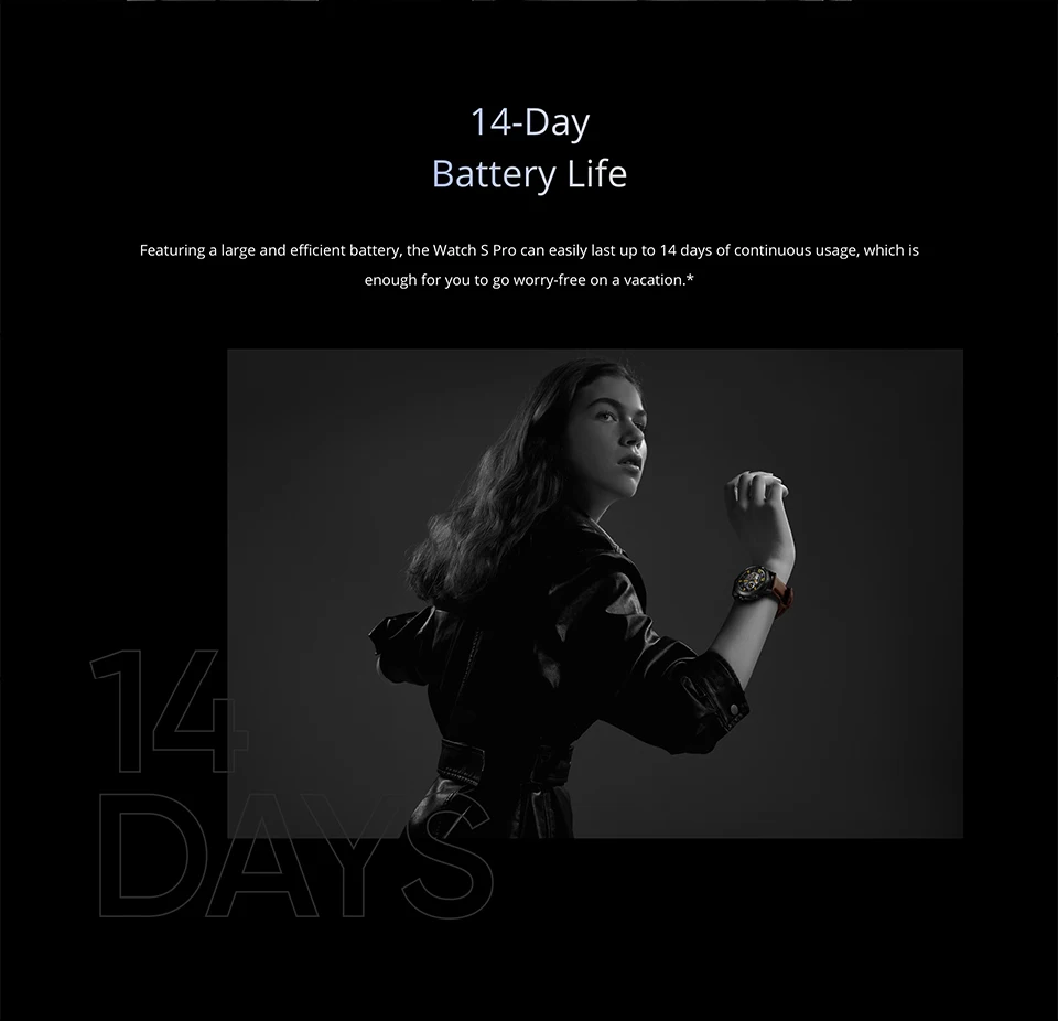 Благодаря большой и эффективной батарее часы S Pro могут легко прослужить до 14 дней непрерывного использования, что достаточно для того, чтобы вы могли без беспокойства отдыхать.