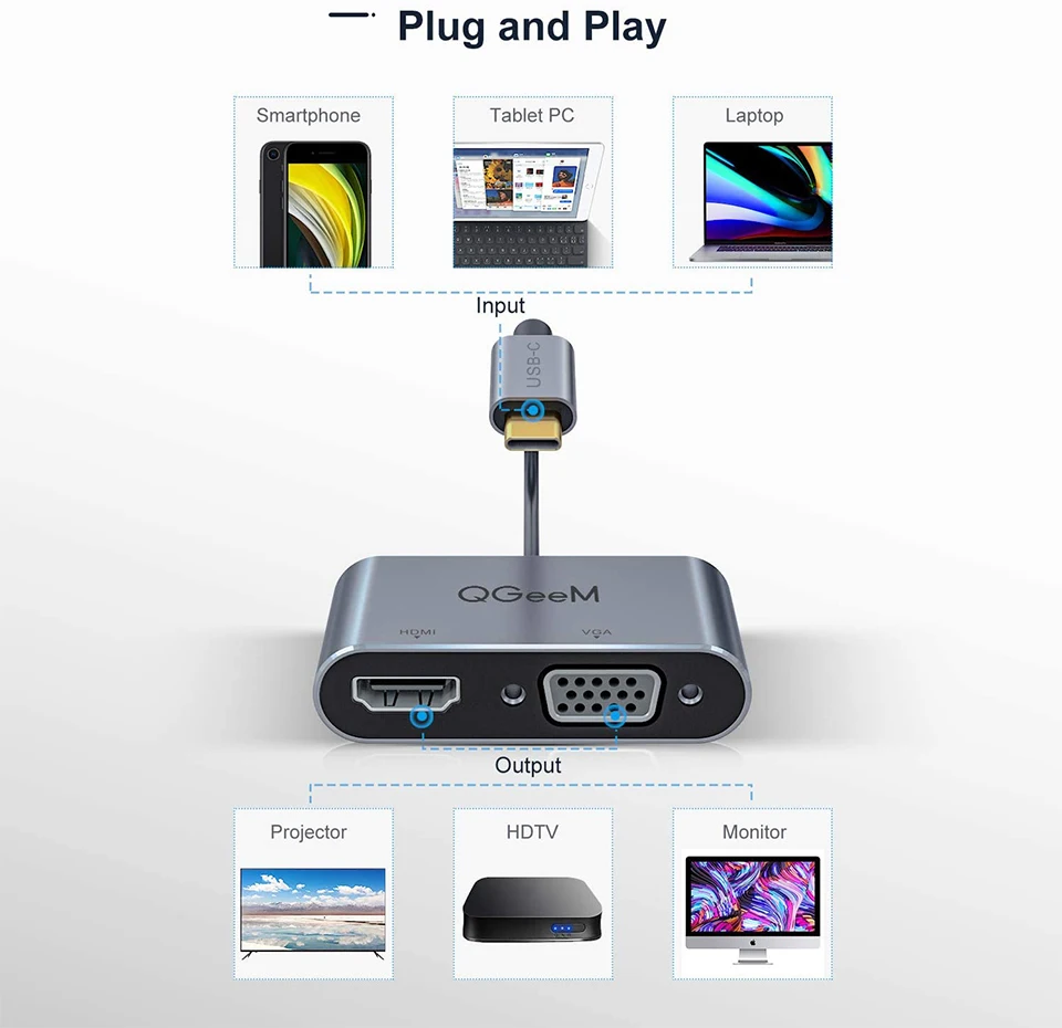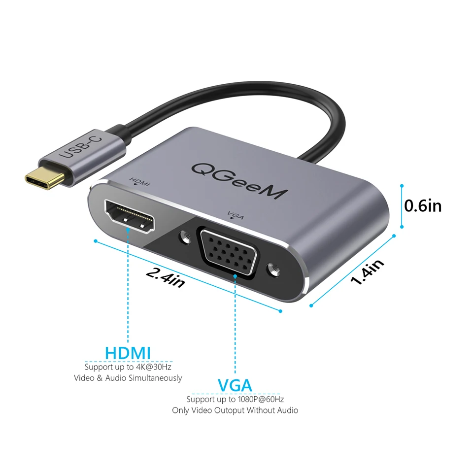 2.USB C к HDMI VGA адаптер: QGeeM 2 в 1 USB C к HDMI VGA адаптер конвертер, встроенный усовершенствованный IC чип Преобразует USB Type C 3,1 цифровой сигнал в VGA и HDMI сигнал. Разрешение Одного выхода HDMI до 4K @ 30 Гц; Разрешение выхода VGA до 1920X1080P@60HZ.When выходных портов HDMI и VGA работают одновременно, разрешение обеих сторон 1080P