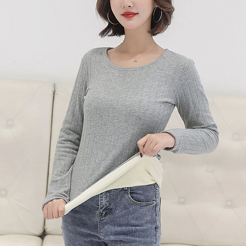 2021 Весенняя бархатная Женская майка, однотонная плюшевая эластичная Женская облегающая теплая рубашка с круглым вырезом, футболка с длинным рукавом