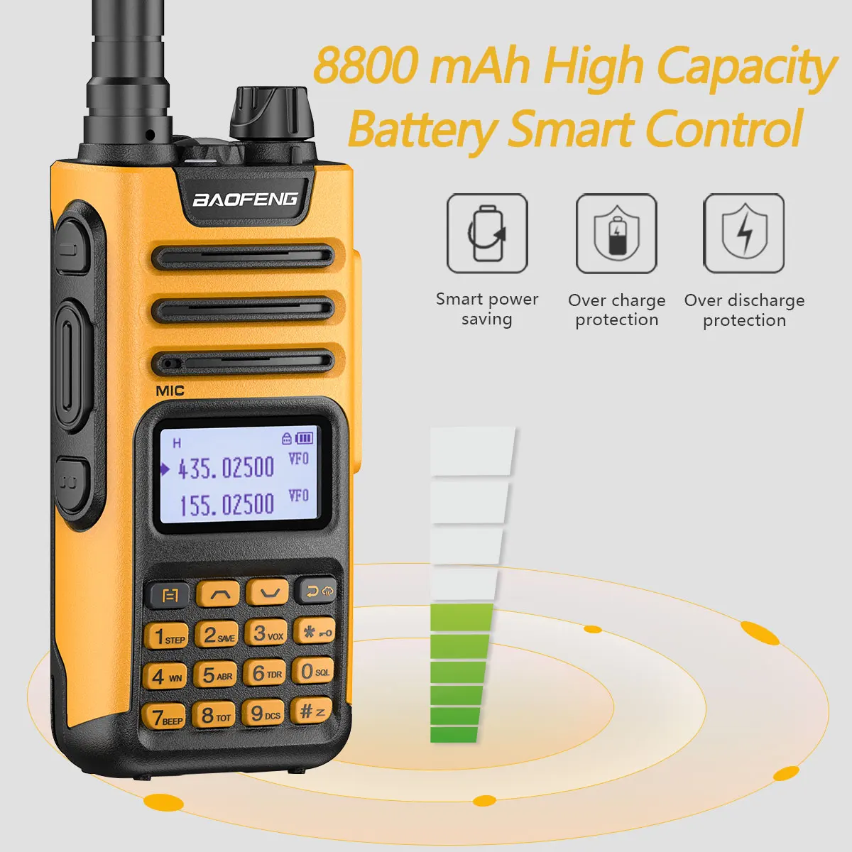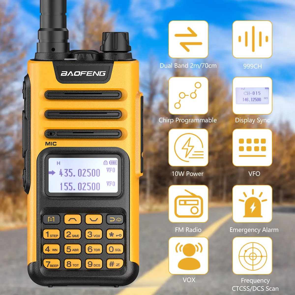 999 каналов памяти; CTCSS/DCS; VOX режим для Hands-Free; A/B Группа независимая работа; Два диапазона; Двойной дисплей; Двойной режим ожидания авто блокировка клавиатуры.