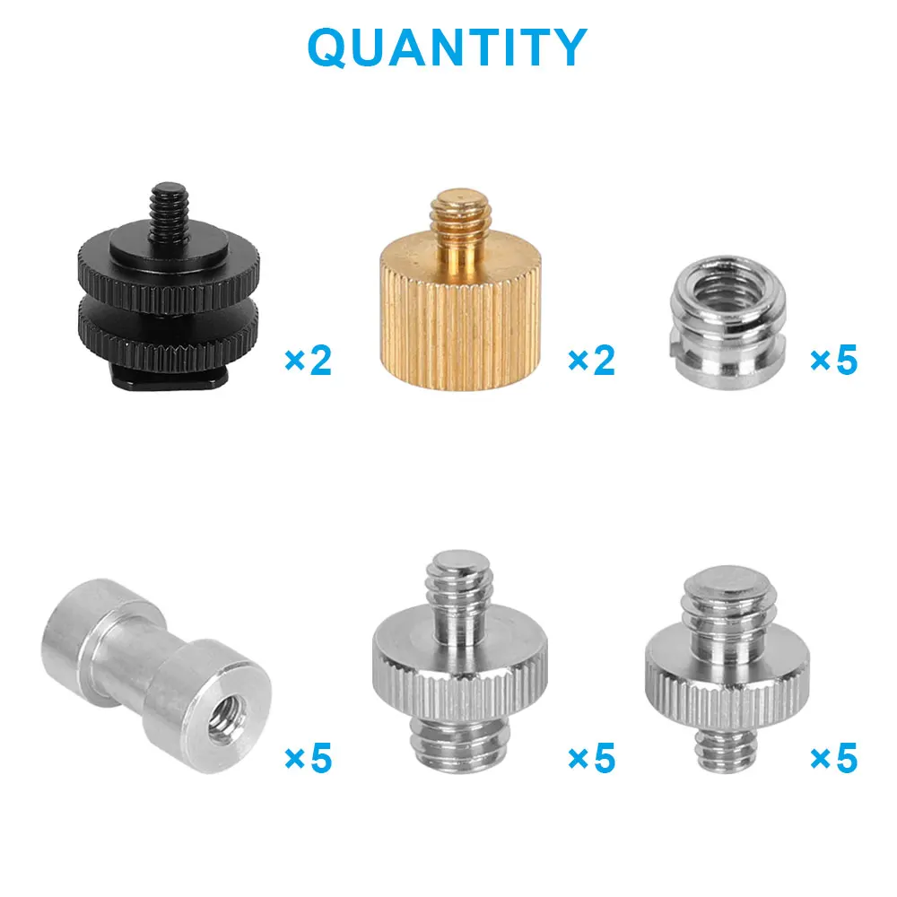 Описание Этот портативный комбинированный пакет включает в себя 24 винтовых адаптера: • Винты втулки редуктора 5*1/4 "до 3/8" • 5*1/4 "штыревые до 3/8" штыревые винты • 5*1/4 "штыревые к 1/4" штыревые винты • Винты с резьбой для камеры 5*1/4 "female to 3/8" female • 2*1/4 "до 3/8" штыревой к женскому латунный винт • Адаптер для крепления башмака 2*1/4 Все эти винтовые адаптеры для камер имеют винтовую резьбу 1/4 "-20 и 3/8" в соответствии с международным стандартом. Подходит для большинства DSLR камер, штатива, монопода, наплечных аксессуаров для камеры. Этот переходник для винта штатива камеры можно прикрепить к широкому спектру различных фотографий и удовлетворить большинство устройств камеры и других аксессуаров. Материал: алюминиевый Металл. Прочный и прочный. Все винты адаптера упакованы в ударопрочный и водонепроницаемый ящик для хранения. Коробка изготовлена из высокопрочного композитного материала и имеет 3 мм PE внутреннюю подкладку для ударопрочности. Длина 135 мм. Широкий 7,8 мм высота: 38 мм, коробки можно хранить винт-адаптер с наружной резьбой исправно, чтобы предотвратить потерю. Легко носить с собой и может использоваться в любое время во время работы. Вы также можете хранить другие фотографические аксессуары в коробке. Вес: 272 г Упаковочный лист 5*1/4 "до 3/8" Винты втулки редуктора 5*1/4 "штыревые до 3/8" штыревые винты 5*1/4 "штыревые к 1/4" штыревые винты Винты с резьбой для камеры 5*1/4 "female to 3/8" female 2*1/4 "до 3/8" штыревой к женскому латунный винт Адаптер для крепления обуви 2*1/4 1 * коробка для хранения