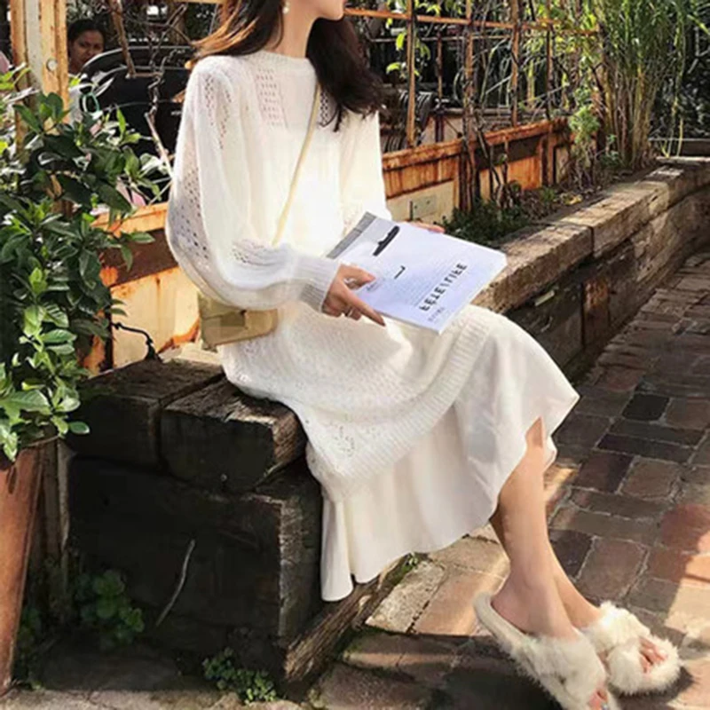 Ажурный вязаный свитер; Базовая юбка на бретельках; Осенний комплект с юбкой