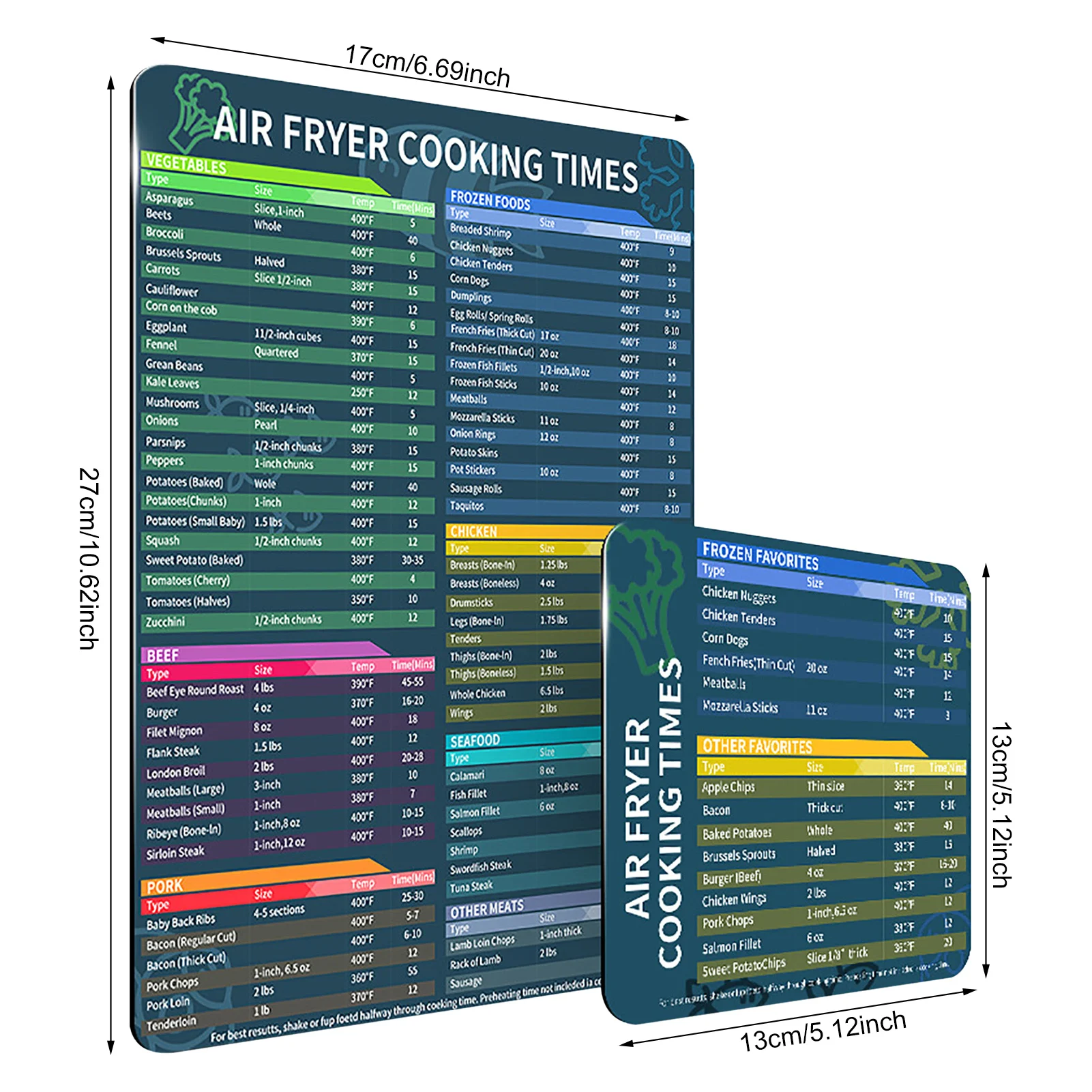 Объем еды. Этот Магнитный шпаргалка экономит время эффективного чтения кулинарных книг или Интернета, и нет необходимости смотреть его в любое время, пока фритюрница работает. Магнитный шпаргалка имеет четкую печать и большие шрифты. Это показывает некоторые из самых популярных замороженных продуктов для быстрого ознакомления.