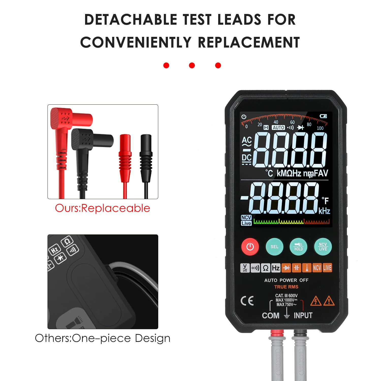 Умное измерение: он может автоматически распознавать напряжение постоянного/переменного тока, частоту, сопротивление, Зуммер непрерывности без ручного переключения.