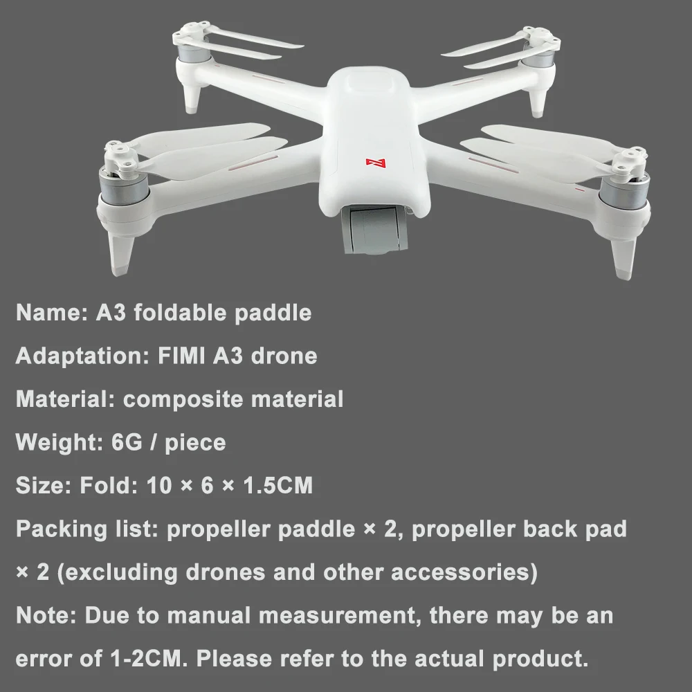 12 September 2022Show moreOpen 2 reviewsDescriptionName: A3 foldable paddle Adaptation: FIMI A3 drone Material: composite material Weight: 8g/ piece Size: Fold: 10 * 6 * 1.5CM Note: Due to manual measurement, there may be an error of 1-2CM. Please refer to the actual product. This link does not contain drones. If necessary, please purchase them in the XIAOMI A3 DRONE category. Thank you for your cooperation. Packing list: propeller forward propeller × 2, propeller backward propeller × 2 (excluding uav and other accessories)