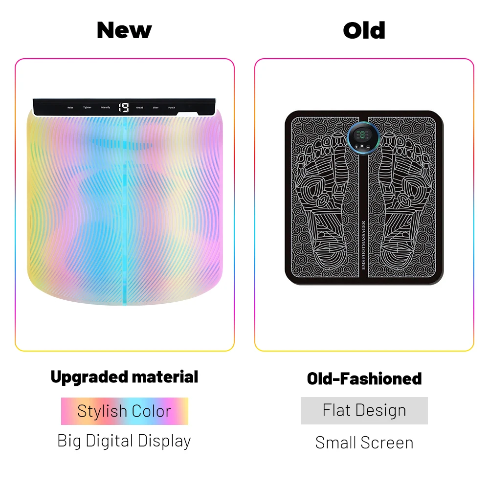 1. Используя микроток EMS, наш красочный коврик для ног может стимулировать и массировать акупунктурные точки, эффективно для снятия боли в мышцах и формирования красивых ног. 2. Этот коврик для ног является проводящим для стимуляции мышц для сокращения мышц и расслабления, уменьшая травму ног, повышая циркуляцию крови, улучшая ваш сон, устраняя усталость и лечение подздоровья. 3. Этот массажер для ног обеспечивает 9 уровней интенсивности и 6 режимов: циркуляция, молоток, разминание, массаж, давление пальцев и расслабление, идеально подходит для ваших потребностей. 4. Коврик для ног легкий, портативный и складной, что удобно для массажа ног и релаксации в любое время и в любом месте. 5. Коврик для ног имеет интеллектуальную индукционную защиту, и он автоматически выключится, когда ваши ноги оставят коврик.
