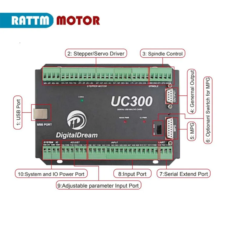 UC300-это высокочастотный внешний контроллер движения для Mach3, с USB портом, передаваемым программным обеспечением Mach 3, sup port ing standard MPG и Digital Dream MPG. Устройство может взаимодействовать с подключением к сети управляющего компьютера. Сетевое соединение может быть построено с прямым подключением через порт USB. Компьютер подключается к UC300 через стандартный usb-кабель. Лучше всего использовать usb-кабель связи, чтобы не обращать внимания на помехи. Устройство может использоваться для управления станками с шаговым или серводвигателем с импульсным и направленным интерфейсом; В Управление; Выходы поддерживают максимум 300 кГц шаговый частота пульт дистанционного управления для each axes и может работать с до 6 осей. Контроллер 3-6 осей для пользовательских опций