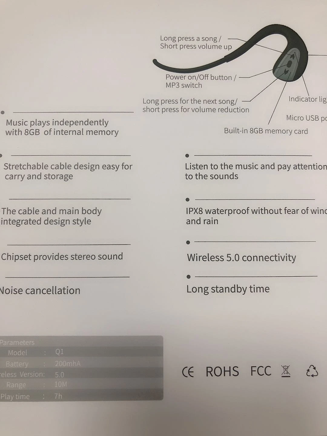 Беспроводная bluetooth-гарнитура Q1 удобно носить, около 8 часов воспроизведения, 15 дней в режиме ожидания. Полностью заряжена, не дожидаясь 2 часов.