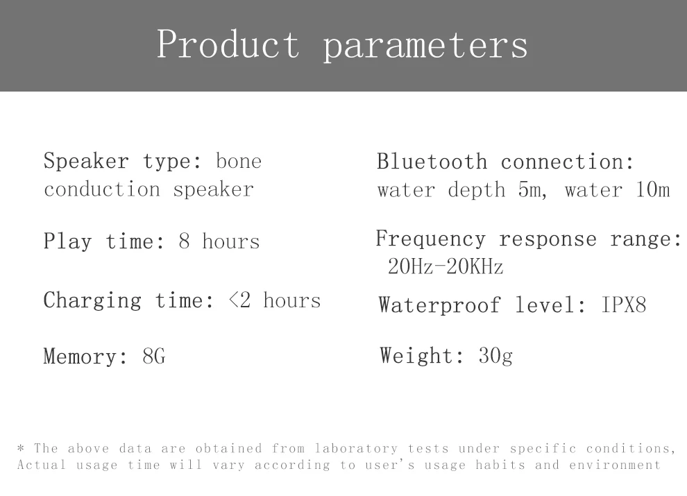 Встроенная память 8G, может хранить 2400 синглов и слушать песни под водой, не подключая мобильный телефон.