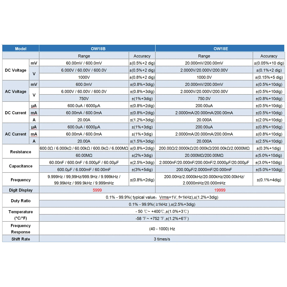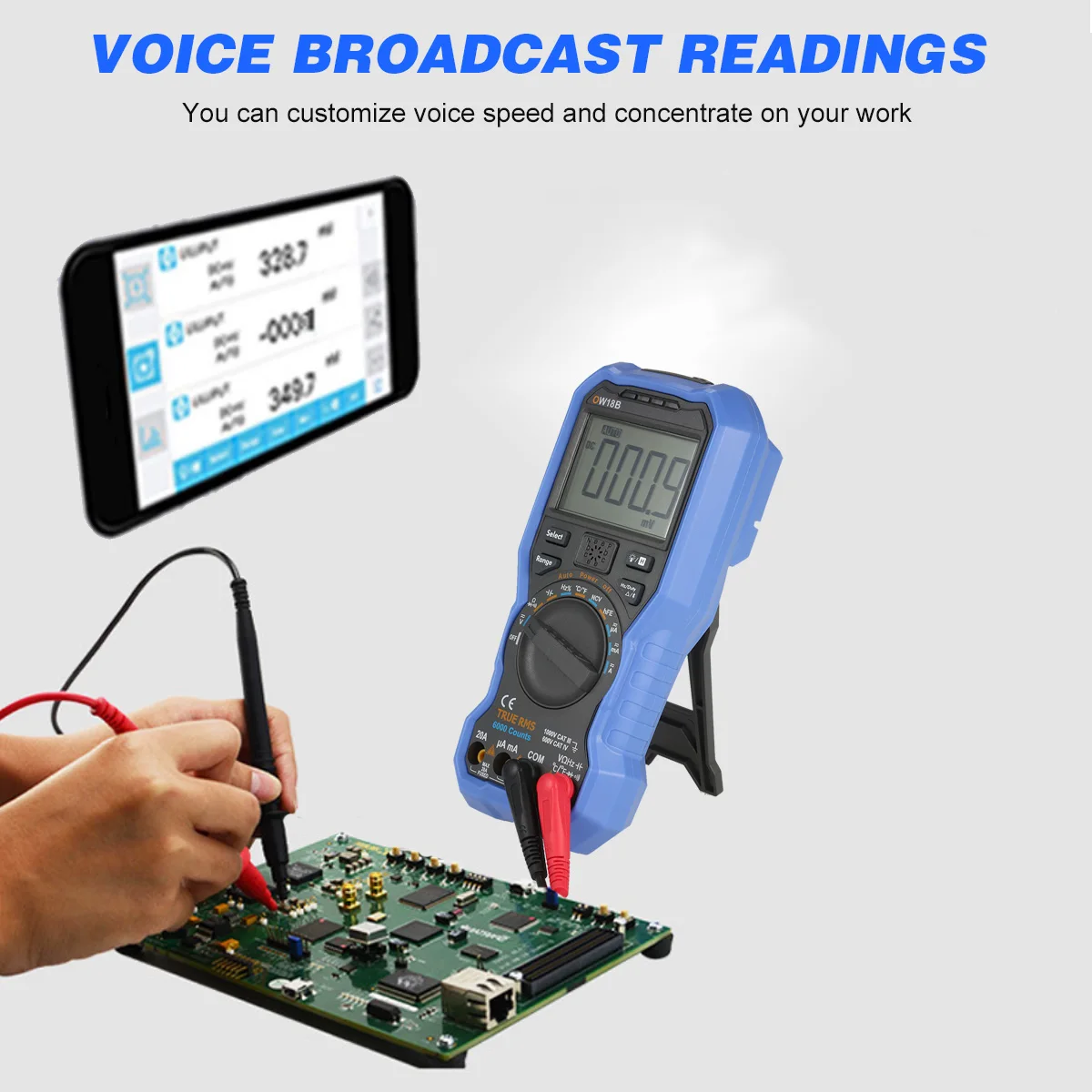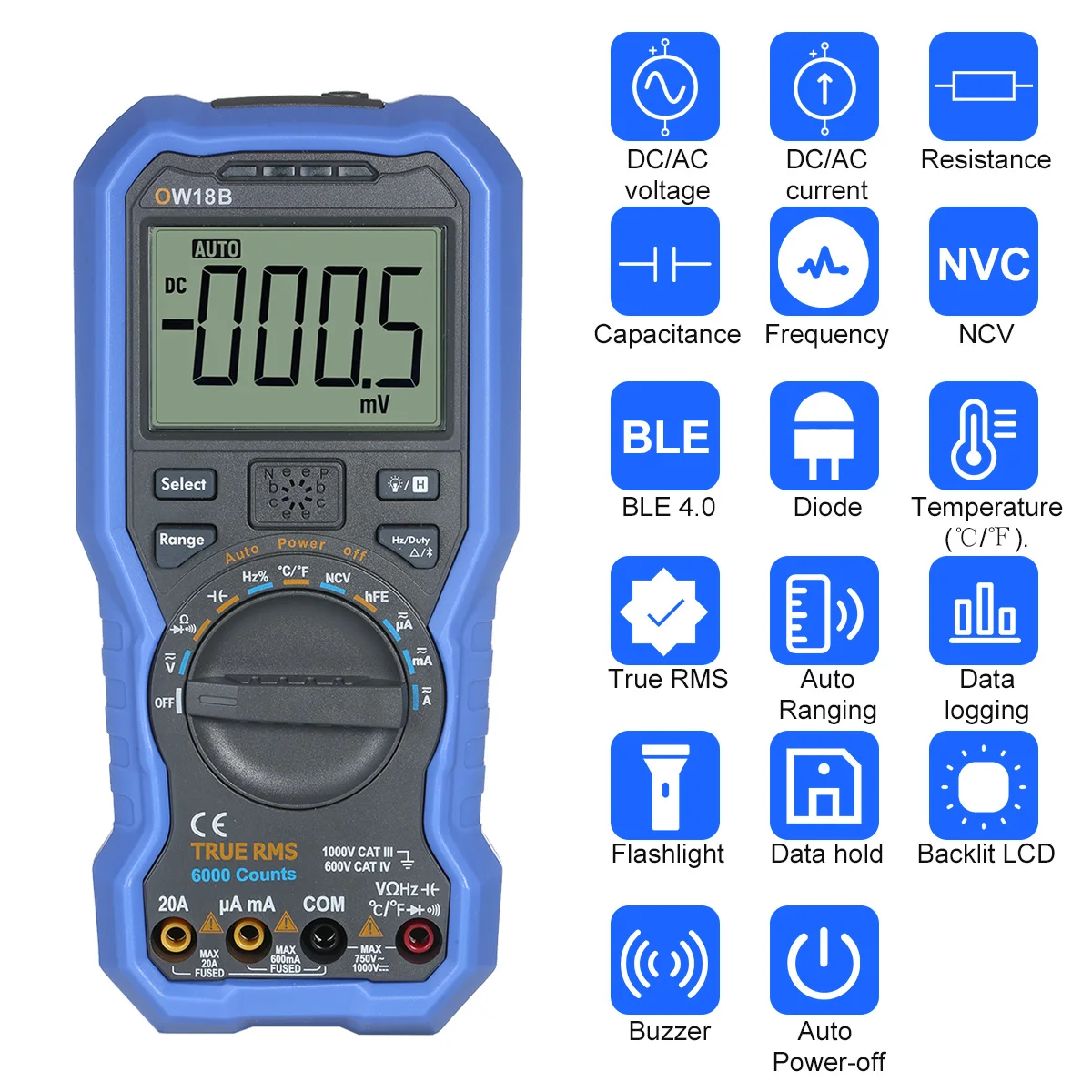 Этот мультиметр может выполнять различные испытания, включая напряжение постоянного/переменного тока, ток переменного/постоянного тока, сопротивление, емкость, частоту, NCV, Диод и температуру (℃/℉). Примечательно, что он оснащен беспроводной передачей BLE 4,0, что позволяет ему подключаться к телефону или ПК и отображать данные в формате диаграммы, что упрощает анализ данных.