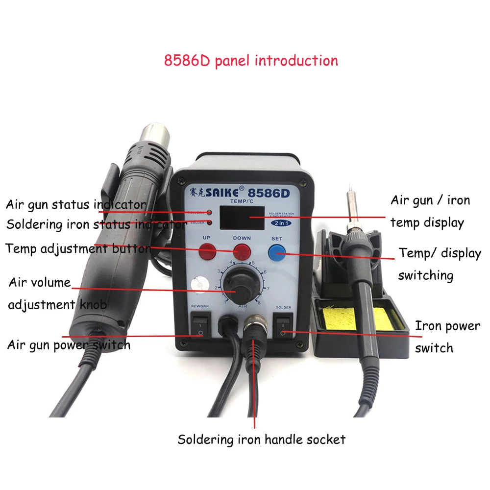 1. 8586D использует технологию управления микрокомпьютерным процессором SAMSUNG PID и точный двойной цифровой дисплей температуры воздушного пистолета и паяльника. Программа отслеживает фактическую температуру воздушного пистолета и паяльника в любое время. Волшебная скорость компенсации температуры еще больше повышает стабильность температуры.