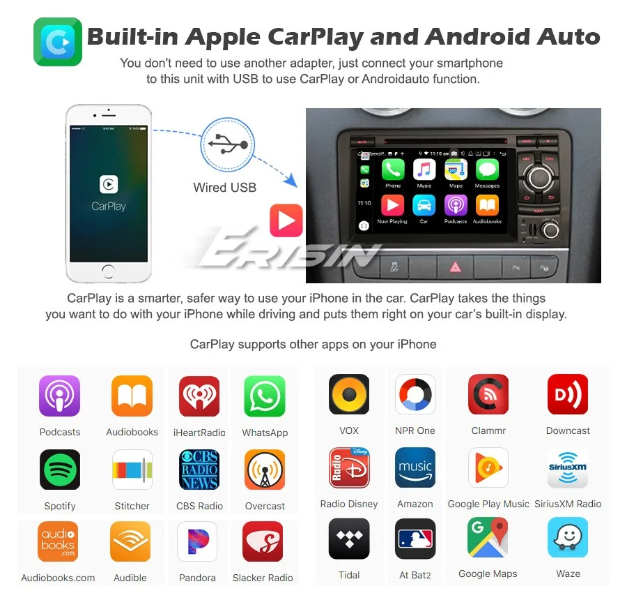 -Встроенный модуль Apple CarPlay и Android Auto. Вам не нужно использовать другой адаптер, просто подключите ваш