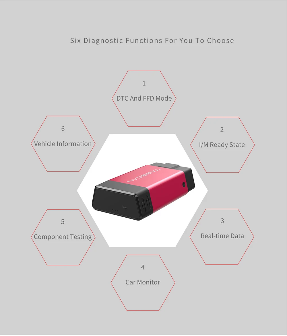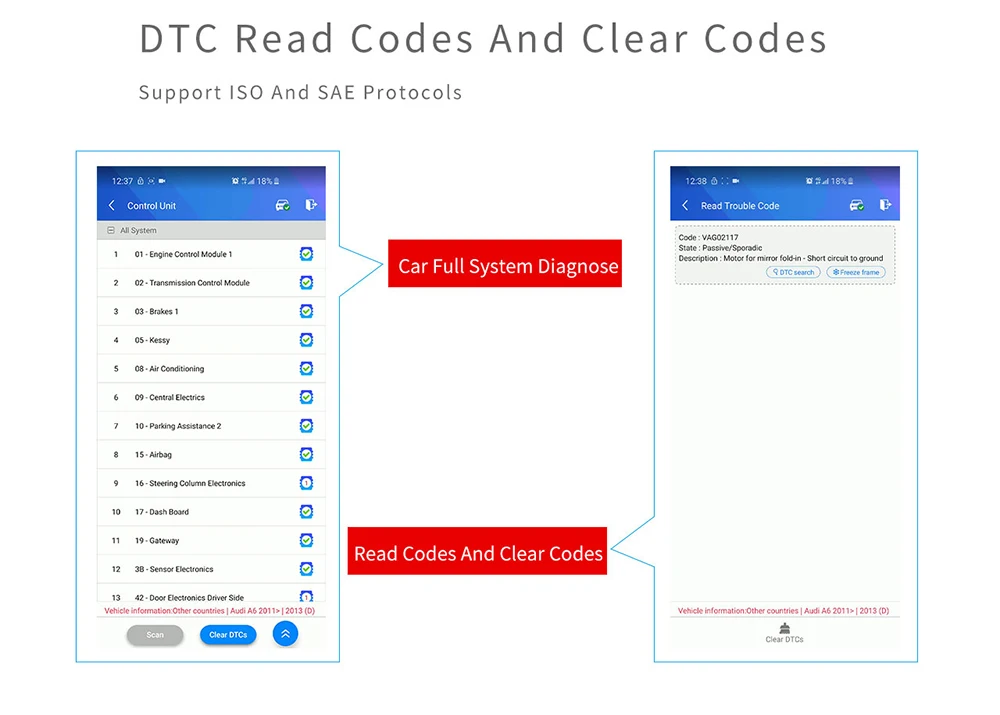 В диагностическом меню есть 7 функций для клиента на выбор 1.DTC & FFD (режим 03/07/0A и режим 02) Чтение DTCs и clear DTCs, замораживание рамок потока данных. Если какие-либо DTCs существуют, будут показаны в отчет, также наше приложение будет писать описание DTCs в конкретной, чтобы пользователь мог понять, в чем проблема. Кроме чтения DTCs, Есть кнопка для очистки DTCs, пользователь может нажать кнопку clear, чтобы легко очистить DTCs.