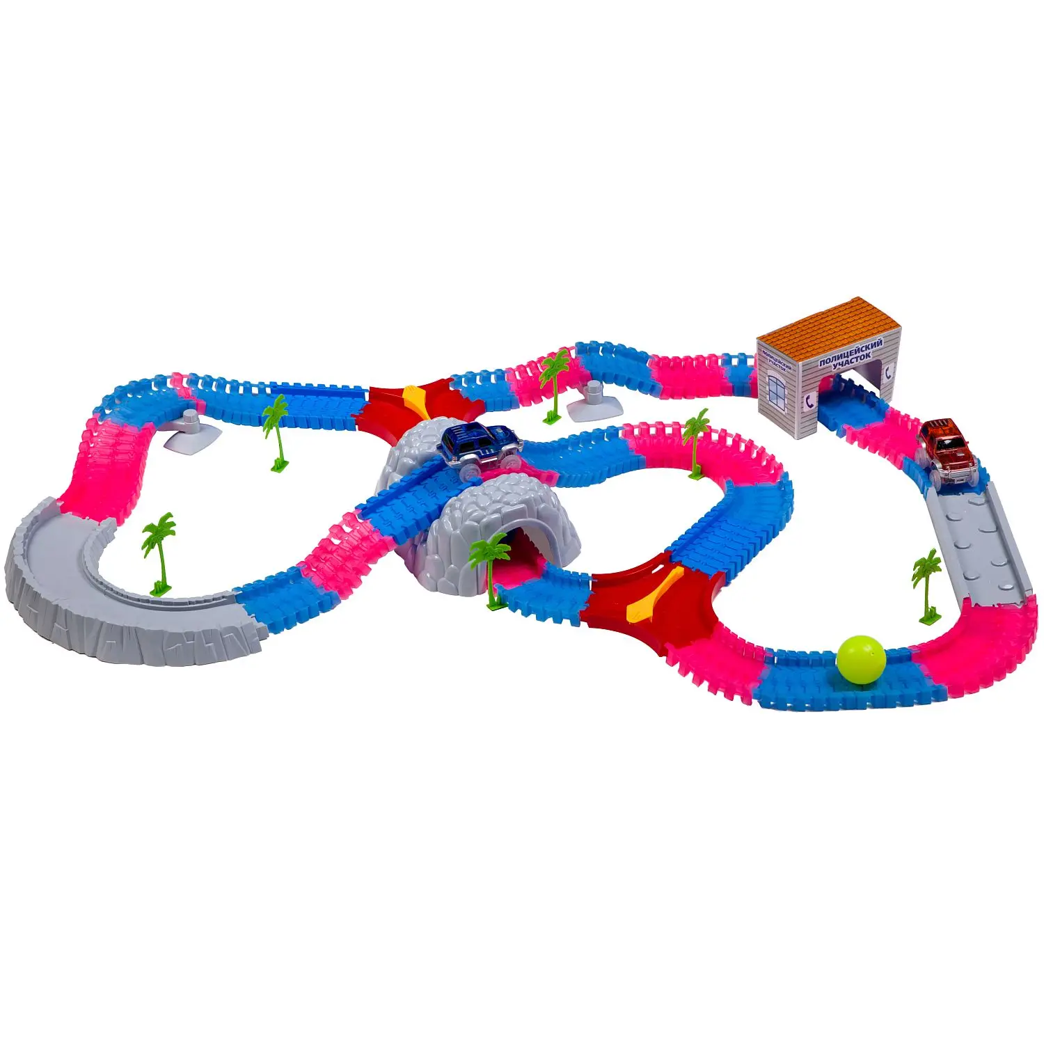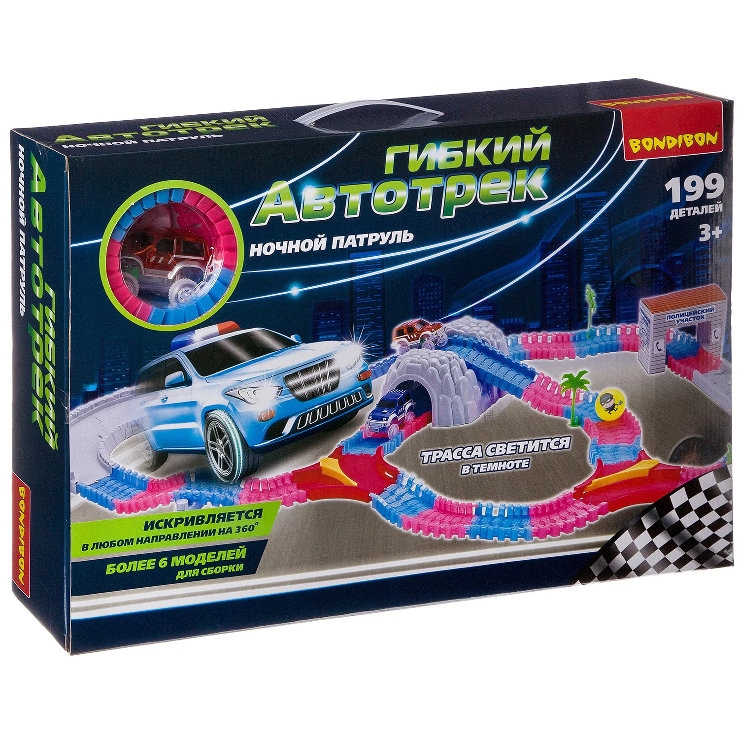 Конструктор поможет развить моторику, воображение, внимательность, пространственное мышление и творческие способности. Познакомит с такими понятиями как скорость, трение, сила тяжести, ускорение и вес. Более 6 моделей для сборки. Изгибается в любом направлении на 360 градусов. Можно создавать горки и препятствия. Флуоресцентная трасса светится в темноте. Гоночная машинка оснащена яркими светодиодами (работает от 1 батарейки АА - не входит в комплект). В состав набора входит: детали для сборки дамбы (6 шт.), тоннель (1 шт.), деревья (6 шт.), стрелка-перевод (2 шт.), шар (1 шт.), флуоресцентная деталь для сборки дороги (175 шт.), набор наклеек, полицейский участок (1 шт.), светящиеся машинки (2 шт.).