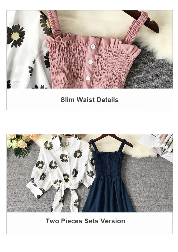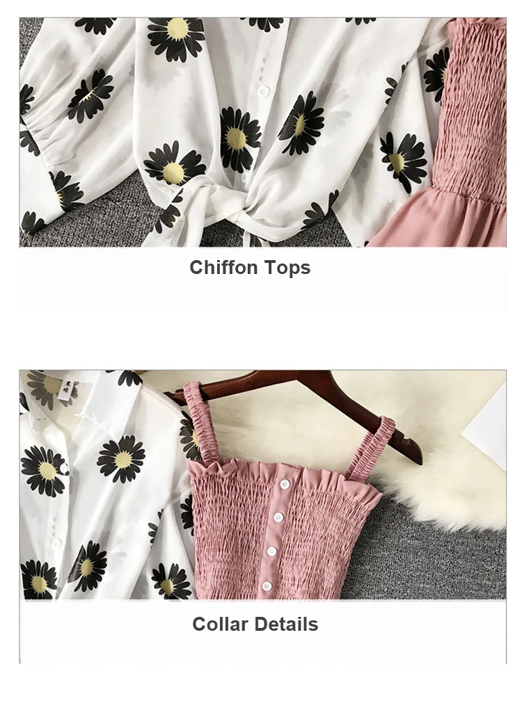 Модный комплект из двух предметов, женская шифоновая рубашка с рукавами-фонариками и отложным цветочным принтом, топ + платье с рюшами на бретельках, Новинка