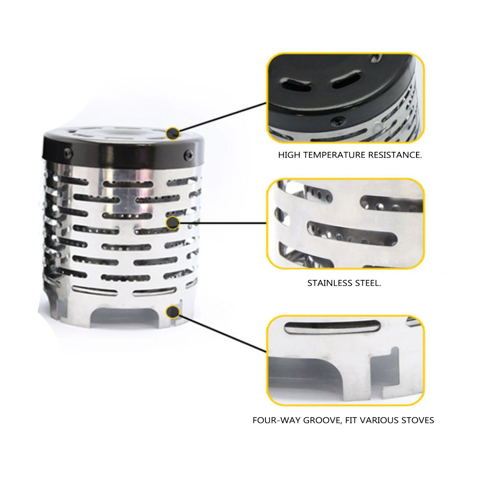 Прочная нагревательная печь, термостойкая мини крышка нагревателя прочная кемпинговая газовая горелка, нержавеющий зимний нагреватель для выживания Особенность: Изготовлен из нержавеющей стали: нержавеющий, прочный, термостойкий, долговечный; Вентиляция предназначена для равномерного распределения тепла от печи для лучшего нагревательного эффекта. Внизу Четыре слота, идеально подходят для газовых горелок и надежно расположены сверху. Благодаря ручке плиту можно вынуть из огня во избежание ожогов рук. Светильник и портативный, легко носить с собой и хранить карман, подходит для активного отдыха на природе. Спецификация: Размер: 115145 мм Вес продукта: 420 г Примечание: В связи с различиями мониторов и эффектами освещения реальный цвет товара может немного отличаться от цвета на фотографиях. Спасибо! Обратите внимание, что допускается отклонение в диапазоне 1–3 см из-за проведения замеров вручную.