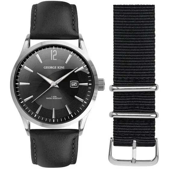 Часы GEORGE KINI – это смелый эксперимент на границе между миром строгой часовой классики и самыми передовыми подиумами модных столиц. Единство строгой формы и манящее разнообразие цветовой палитры рождают поистине уникальный продукт. Вместе с кожаным ремешком или браслетом к каждым часам прилагается еще один нейлоновый ремень в стиле НАТО. Замена ремешка полностью преображает часы, и вы получаете два аксессуара. В оригинальном боксе, в котором поставляются часы, уже вложена и отвертка для смены ремешка, и даже контейнер с запасными втулками – на случай, если владелец потеряет одну из них. Также такой комплект превращает часы в прекрасный подарок.