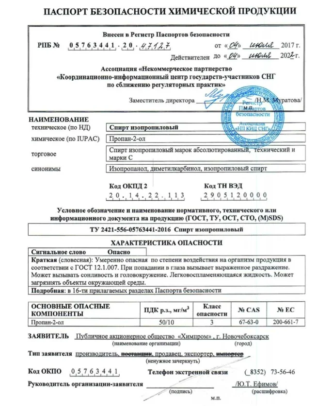 Для информации: спирт производителя ЗАО "Завод синтетического спирта" г. Орск, более не поставляется, т.к. предприятие было в 2019 году объявлено банкротом и все имущество выставлено на торги. Спирт переработанный в 2020 году во время пандемии не дал возможность им вернуться на рынок.