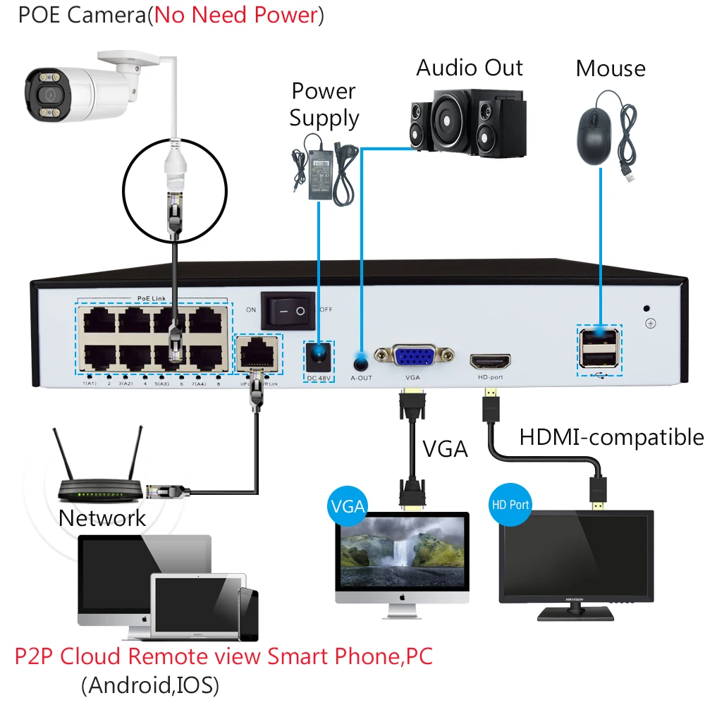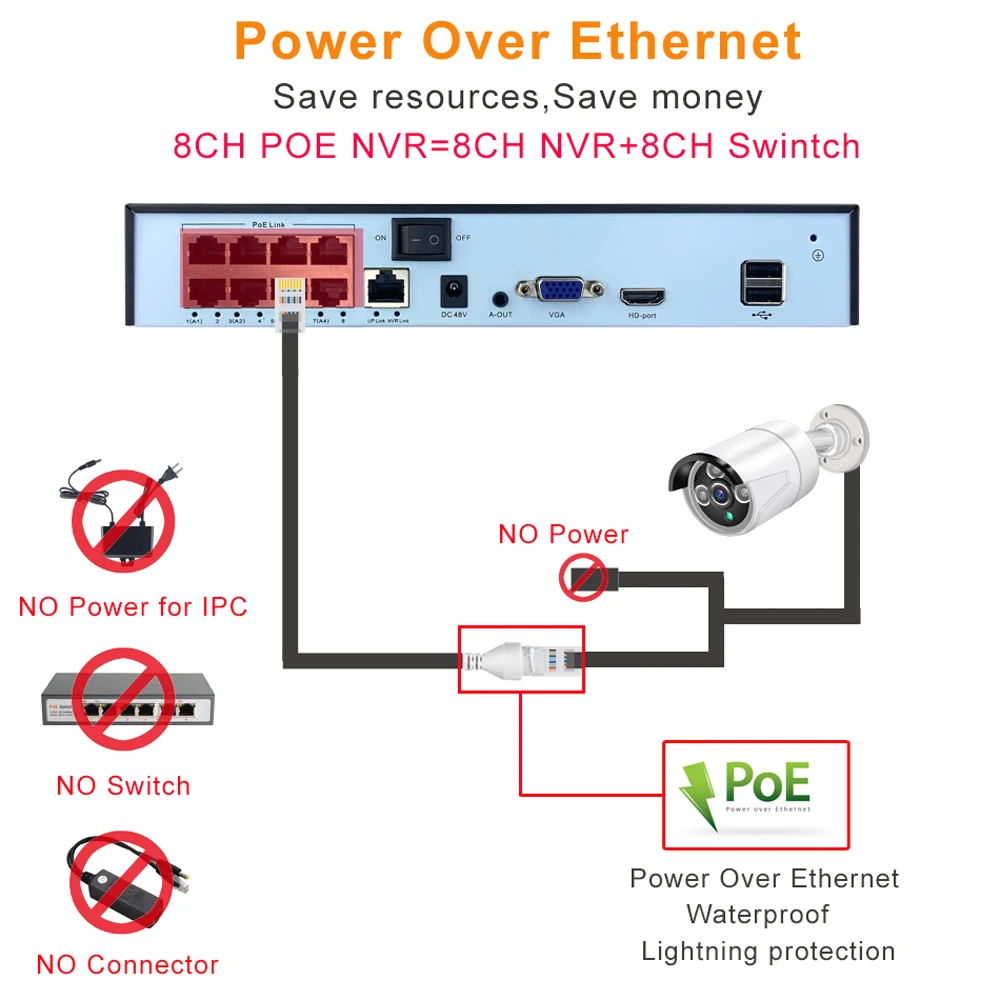 Питание через Ethernet означает, что ip-камеры подключаются к NVR с помощью одного кабеля, который передает как данные, так и мощность, нет необходимости подключать кабель питания, снизить риск утечки электроэнергии и легко настроить. Это в буквальном порядке упрощает установку и снижает затраты.