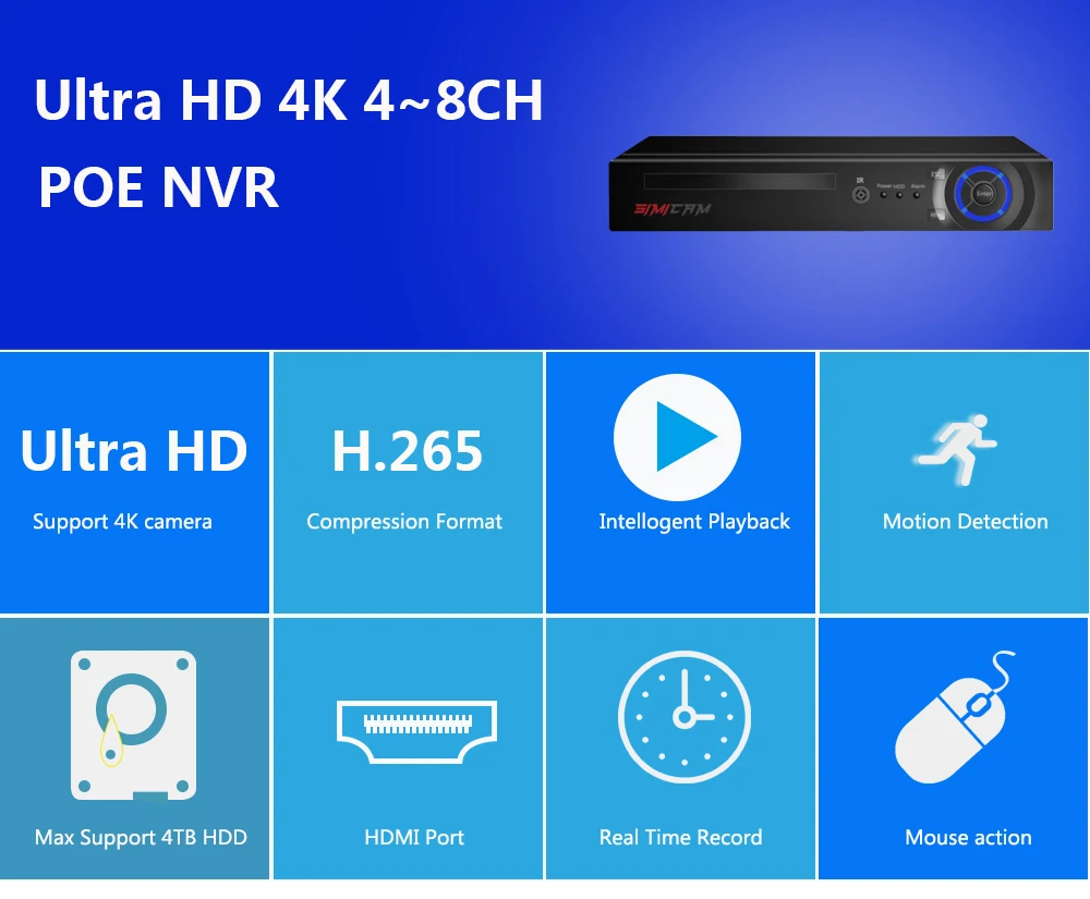 SIMICAM 4K PoE NVR с 8 PoE портами может расширяться 8 каналов. Поддержка 720p/1080p/3MP/4MP/5MP/8MP/4K ip-камеры с питанием по POE