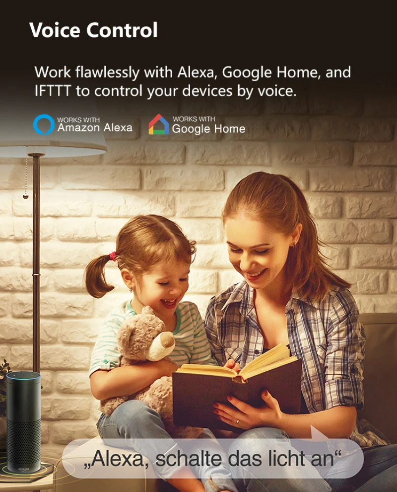 Эта умная вилка позволяет Голосовое управление с помощью Alexa/Google. Простая и быстрая работа путем сканирования qr-кода для загрузки приложения (app Store /Google play Store)