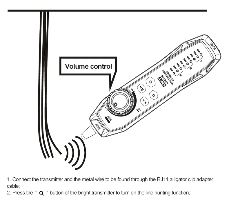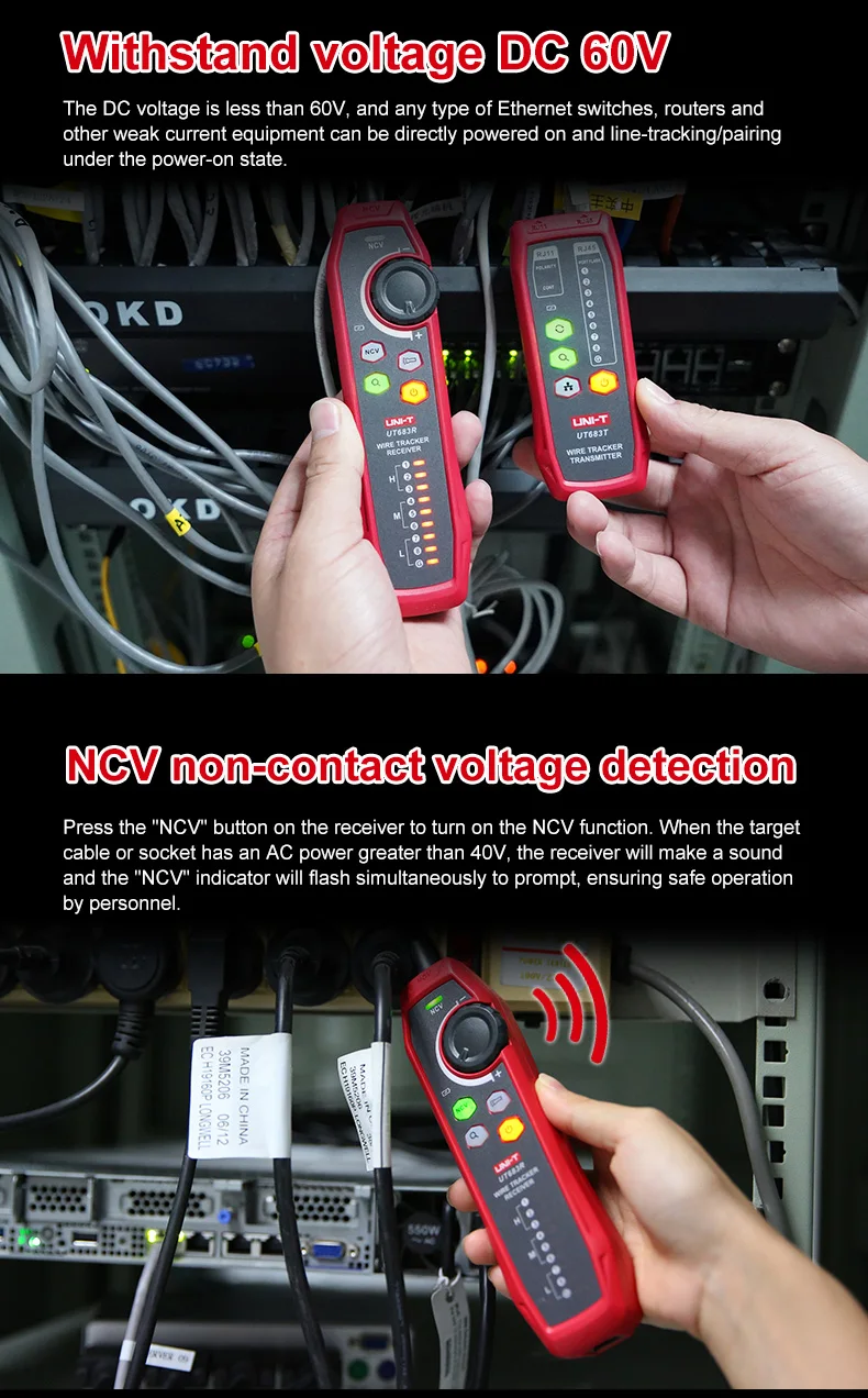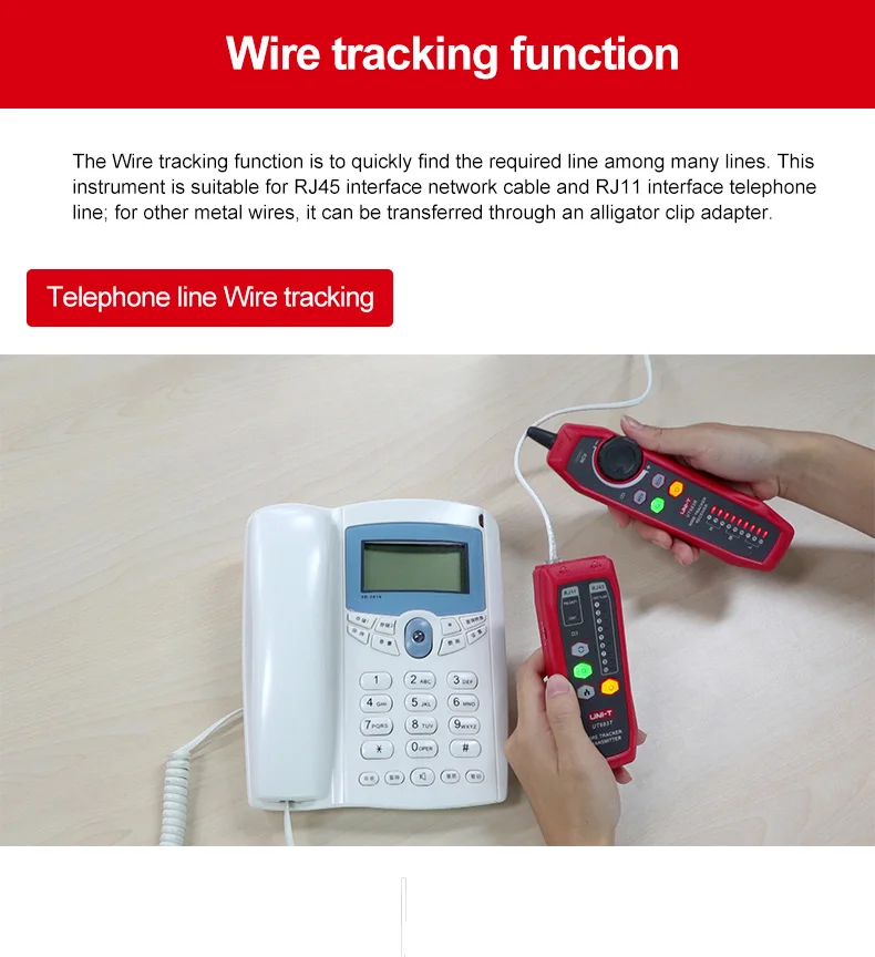 Устройство представляет собой Интеллектуальный проводной трекер, который состоит из передатчика и приемника, этот комплект разработан с сильной защитой от помех. Приемник может быстро и точно определить местоположение целевого кабеля. Этот комплект может автоматически определять открытые, короткие, полярные и быстро выявлять сбой кабеля.
