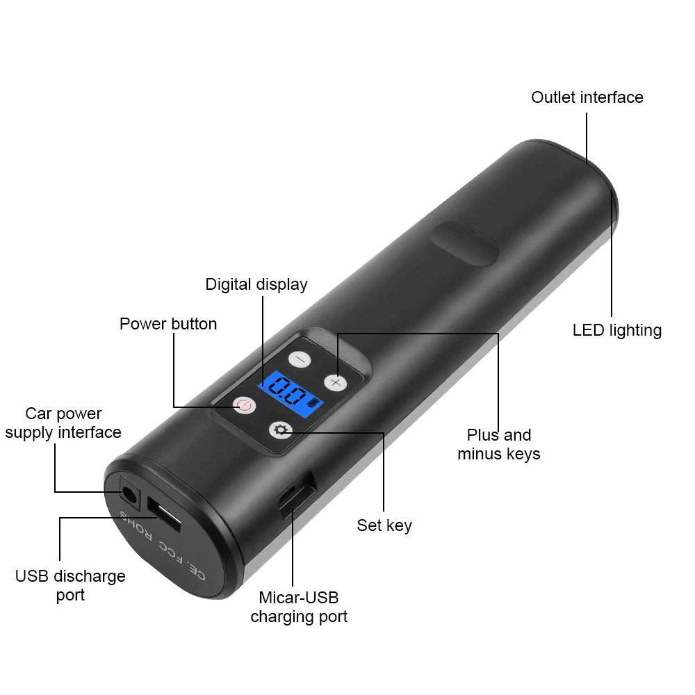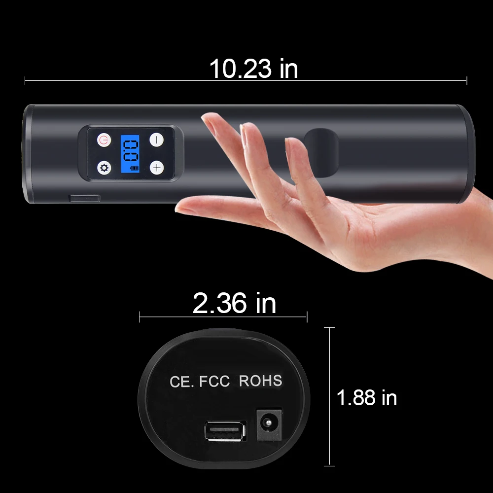 ● Перезаряжаемая батарея большой емкости: с 2000 мАч сертифицированным литий-ионным аккумулятором, этот портативный компрессор готов надуть велосипед, мяч и т. д. usb-порт для зарядки поддерживает быструю зарядку.