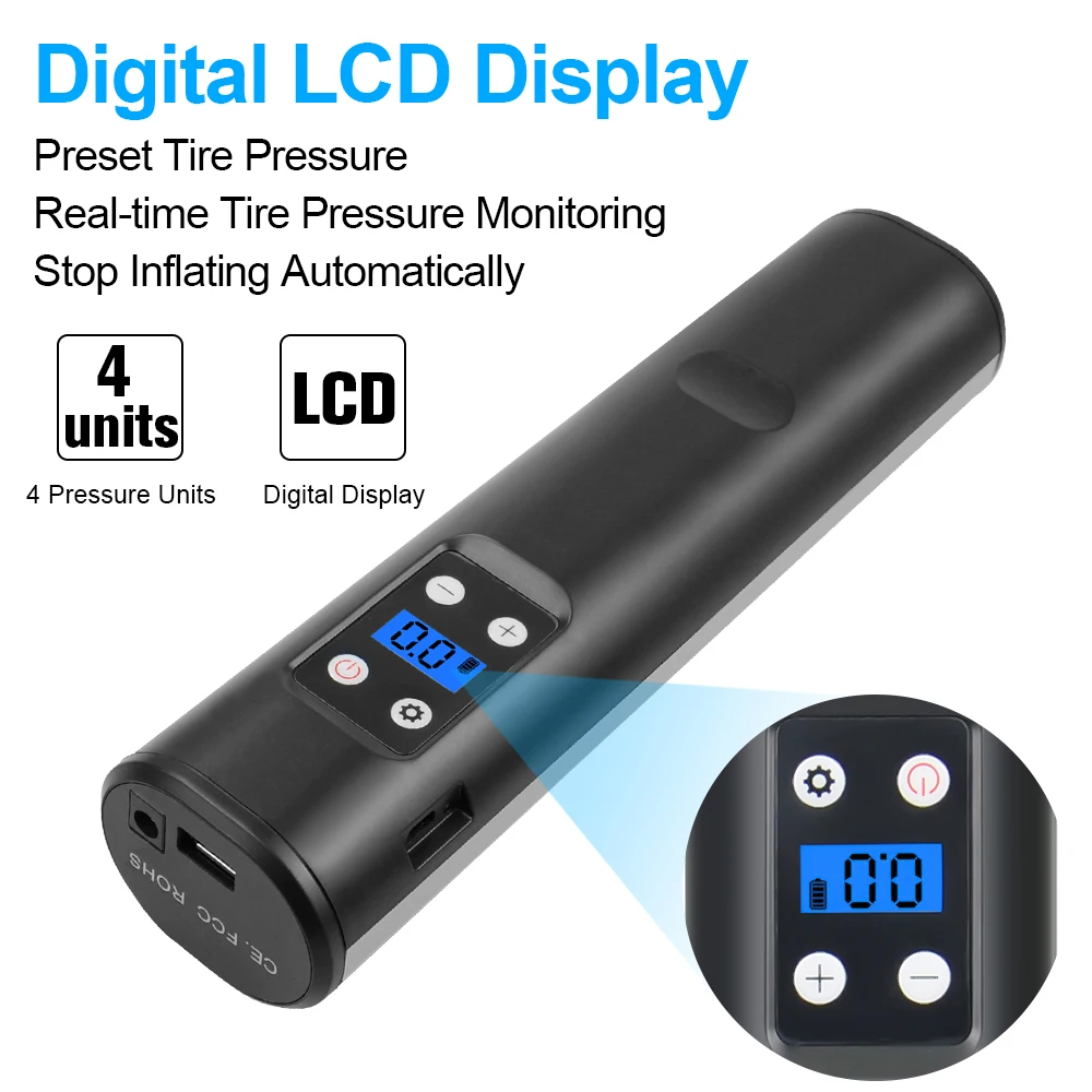 ● Беспроводной и портативный: беспроводной дизайн и компактный мини-размер делают воздушный компрессор портативным и простым в эксплуатации одной рукой. Компрессор готов всего за 4 шага. ЖК-дисплей показывает давление воздуха. Подходит для надувания, когда автомобильные шины недостаточны и полностью надуты шины для велосипедов и мотоциклов;