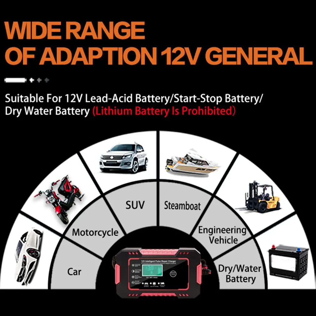 5. Применение транспортного средства: импульсное Ремонтное зарядное устройство подходит для внедорожников, небольших пароходов, мотоциклов, инженерных транспортных средств, автомобилей, батарей для сухой воды.