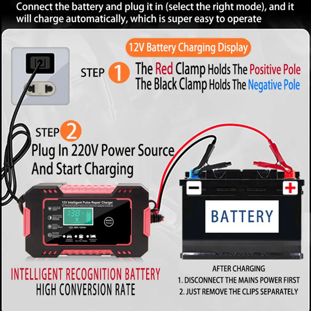 2. Широкий диапазон адаптации: импульсное зарядное устройство подходит для 12 В свинцово-кислотных батарей или пусковых батарей, батарей для сухой воды, но Литиевые Батареи запрещены.