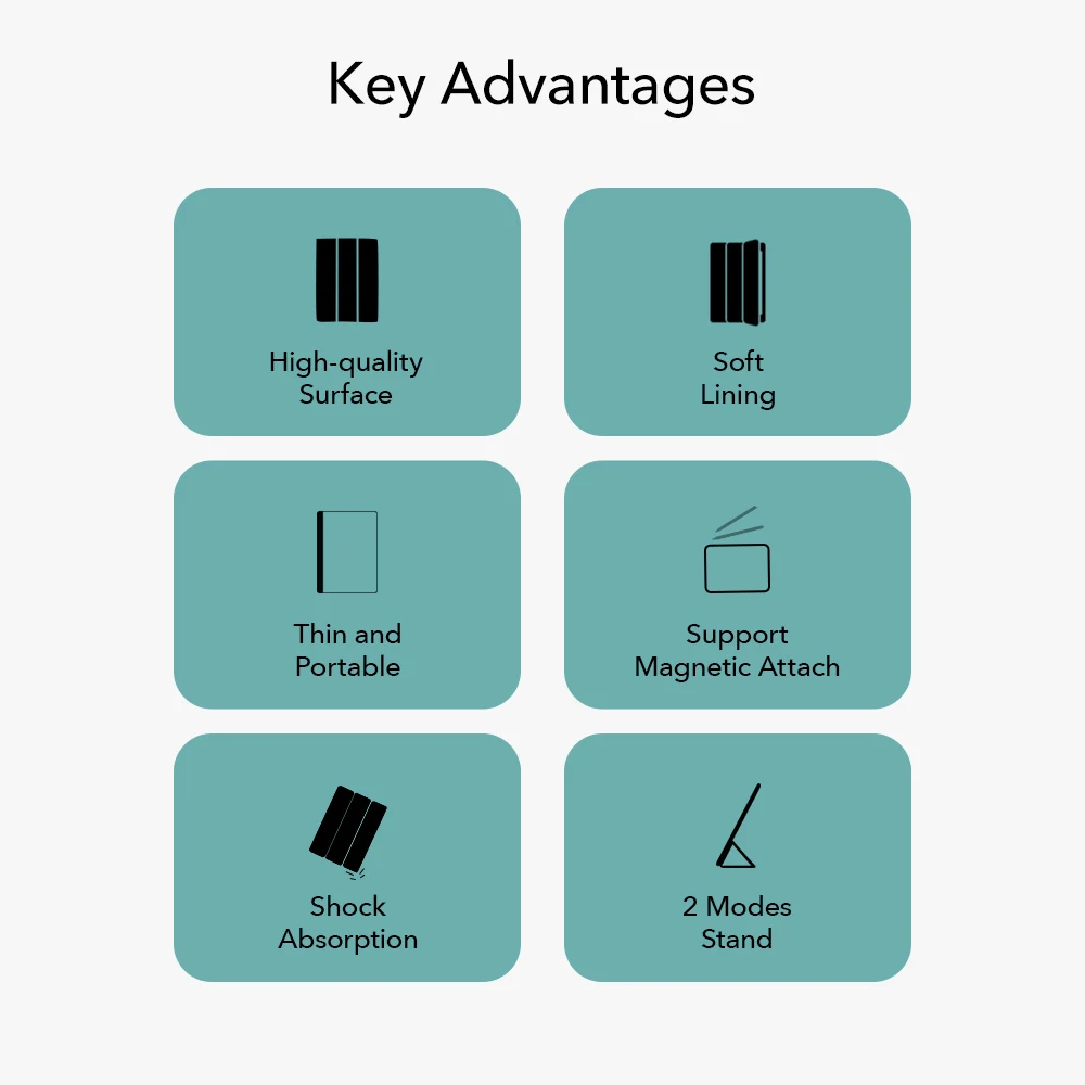 1. Высококачественная поверхность 2. Мягкая подкладка 3. Тонкий и портативный 4. Поддержка магнитного крепления 5. Амортизация 6. Режимы стойки