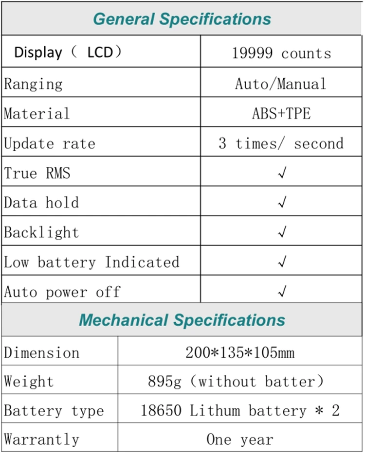 Этот продукт является литиевым аккумулятором, верно RMS, многофункциональный цифровой мультиметр Авто-диапазона с ЖК-дисплеем 19999 отсчетов и регулируемой яркостью подсветки. Он оснащен часами, будильником, Bluetooth для воспроизведения музыки, температурным дисплеем.