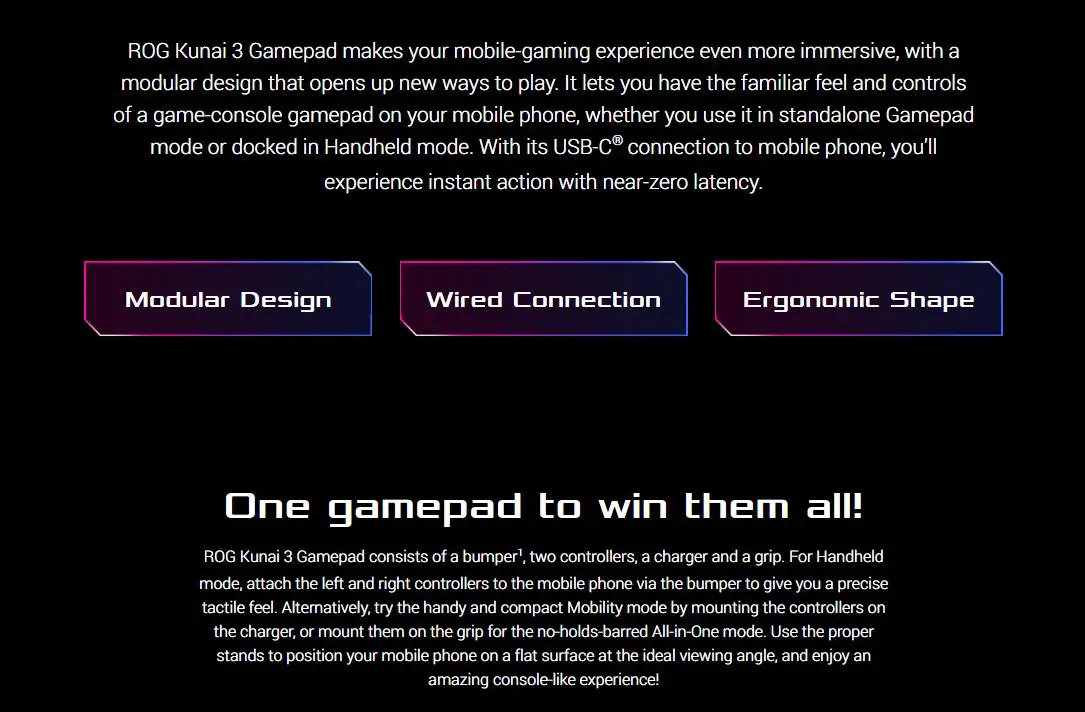 Геймпад ROG Kunai 3 может быть подключен непосредственно на ваш мобильный телефон с помощью проводного USB-C®Подключение, для мгновенных действий и ультра-отзывчивых игр в любое время.