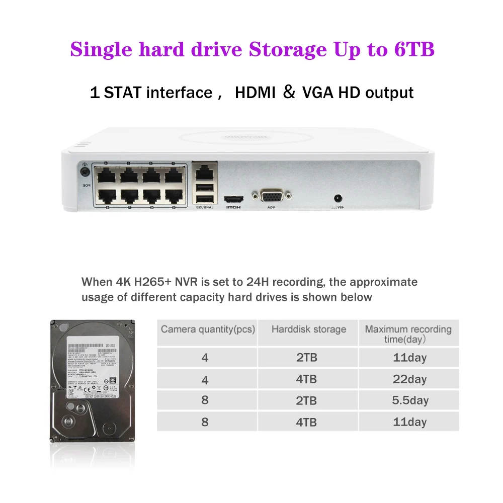 (1 SATA отдельный поддерживает до 6 ТБ, которая может лучше запись и воспроизведение ситуации во время контроля времени, чтобы защитить вашу безопасность имущества