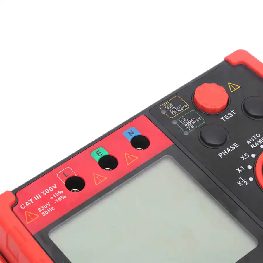 Проверка проводки: верны ли три светодиодный индикатора, P-E и P-N Два зеленых индикатора светильник s включен, красный индикатор светильник не включен, это правильно: тест может быть запущен только тогда, когда проводка верна.