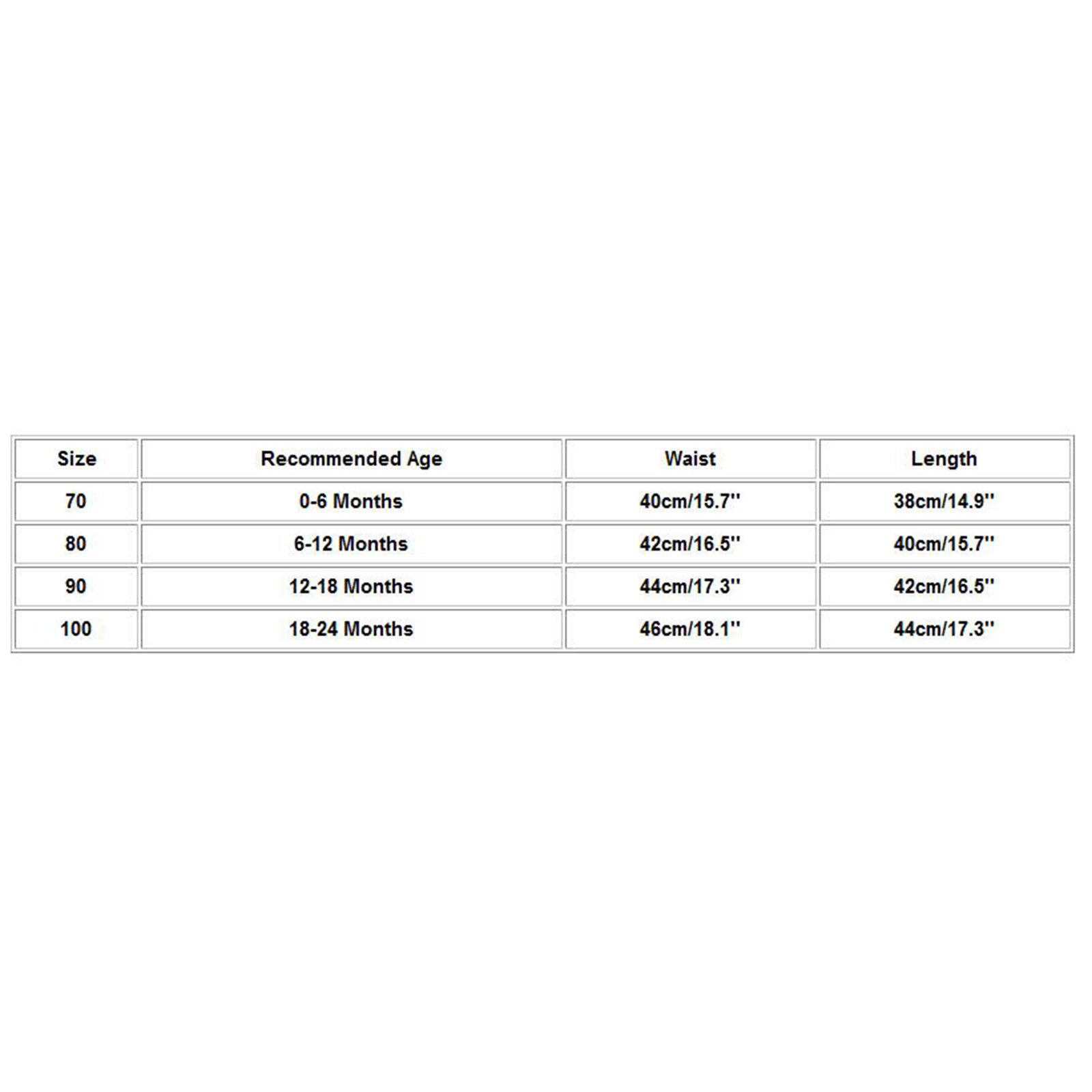 Размер Рекомендуемый возраст Талия Длина 70 0-6 месяцев 40 см/15,7'' 38 см/14,9'' 80 6-12 месяцев 42 см/16,5'' 40 см/15,7'' 90 12-18 месяцев 44 см/17,3'' 42 см/16,5'' 100 18-24 месяцев 46 см/18,1'' 44 см/17,3''