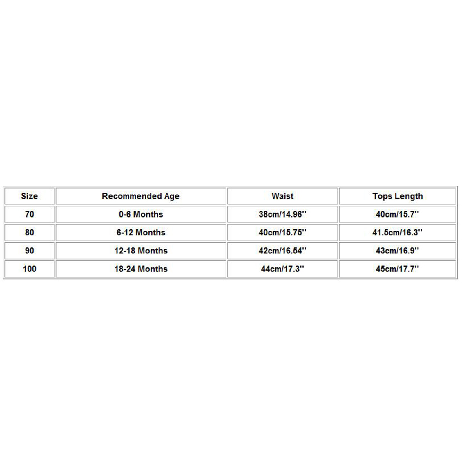 Размеры Рекомендуемый возраст Талия Длина топа 70 0-6 месяцев 38 см/14,96'' 40 см/15,7'' 80 6-12 месяцев 40 см/15,75'' 41,5 см/16,3'' 90 12-18 месяцев 42 см/16,54'' 43 см/16,9'' 100 18-24 месяцев 44 см/17,3'' 45 см/17,7''