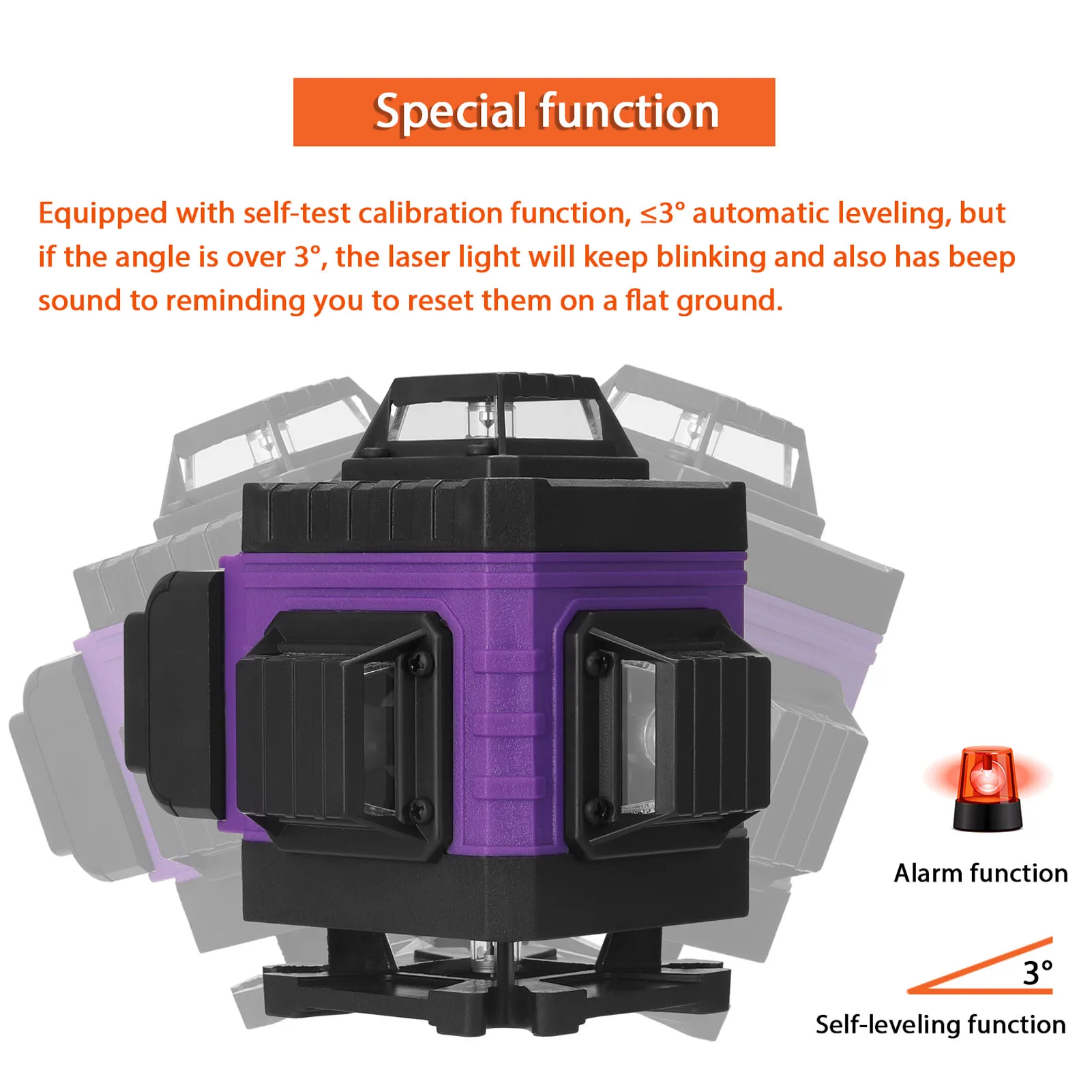 Оснащен функцией самостоятельной калибровки, ≤ 3 ° автоматическое выравнивание, но если угол превышает 3 °, лазерный светильник будет продолжать мигать, а также имеет звуковой сигнал, чтобы напомнить вам, чтобы сбросить их на ровную поверхность.
