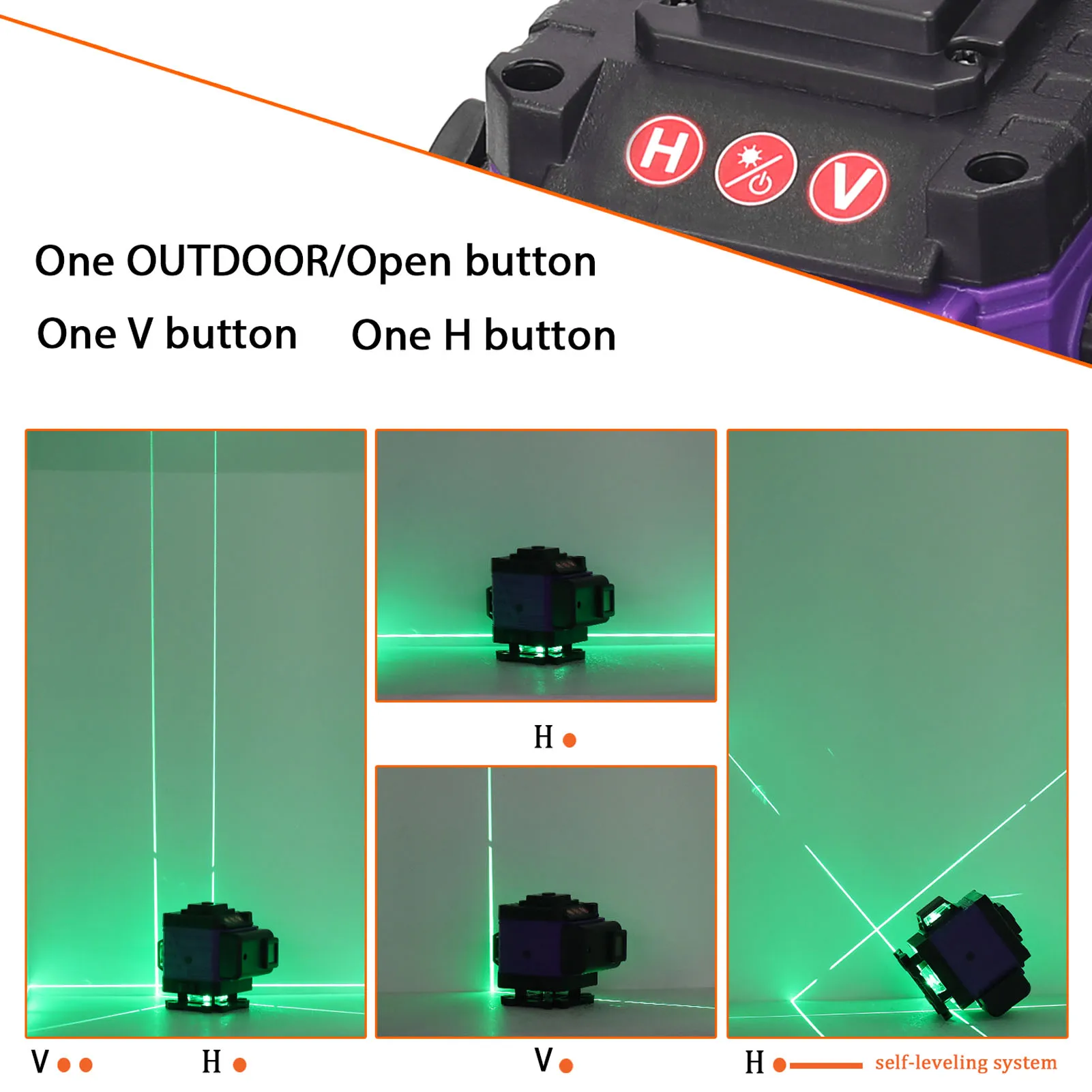 Оснащен функцией самостоятельной калибровки, ≤ 3 ° автоматическое выравнивание, но если угол превышает 3 °, лазерный светильник будет продолжать мигать, а также имеет звуковой сигнал, чтобы напомнить вам, чтобы сбросить их на ровную поверхность.