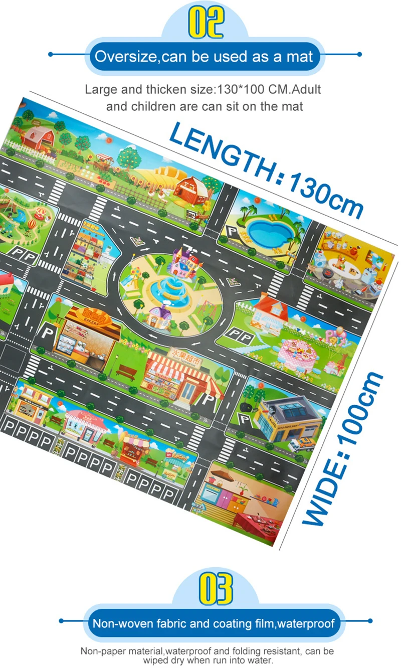 Наименование товара: детский игровой коврик, детская карта города, дорожные маршруты, модель автомобиля, игрушечный образовательный коврик, дорожные знаки, Интерактивная разработка, ползание Название отдела: детские игрушки Стиль: детский игровой коврик Материал ковра: Нетканая PE бумага, водонепроницаемая Используется для: Ползания ребенка, домашней игры, спальни, детской комнаты, образования Детали деталей Коврик 01, 130*100 см