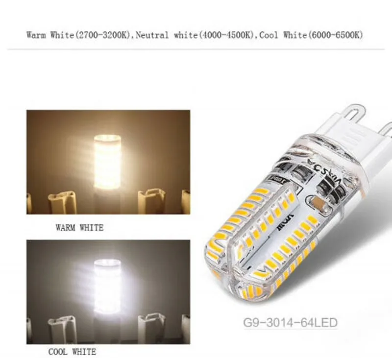Мощность: 7 Вт/9 Вт/10 Вт/12 Вт Напряжение: переменный ток 220 В Диаметр: 48/64/96/104 шт тип розетки: G9 Угол освещения: 360 Поверхность: модель светодиодный одного чипа из силикагеля: SMD 2835/3014 цвет: теплый белый/холодный белый Цветовая температура: 2700-3500K/5500K-6500K