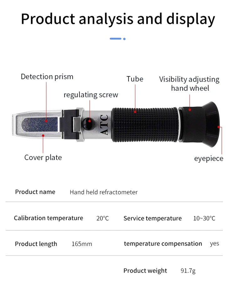 1. Бренд SOONDA, практичный ручной измеритель по шкале Брикса, является инструментом, который измеряет концентрацию водного раствора путем измерения коэффициента преломления водного раствора.