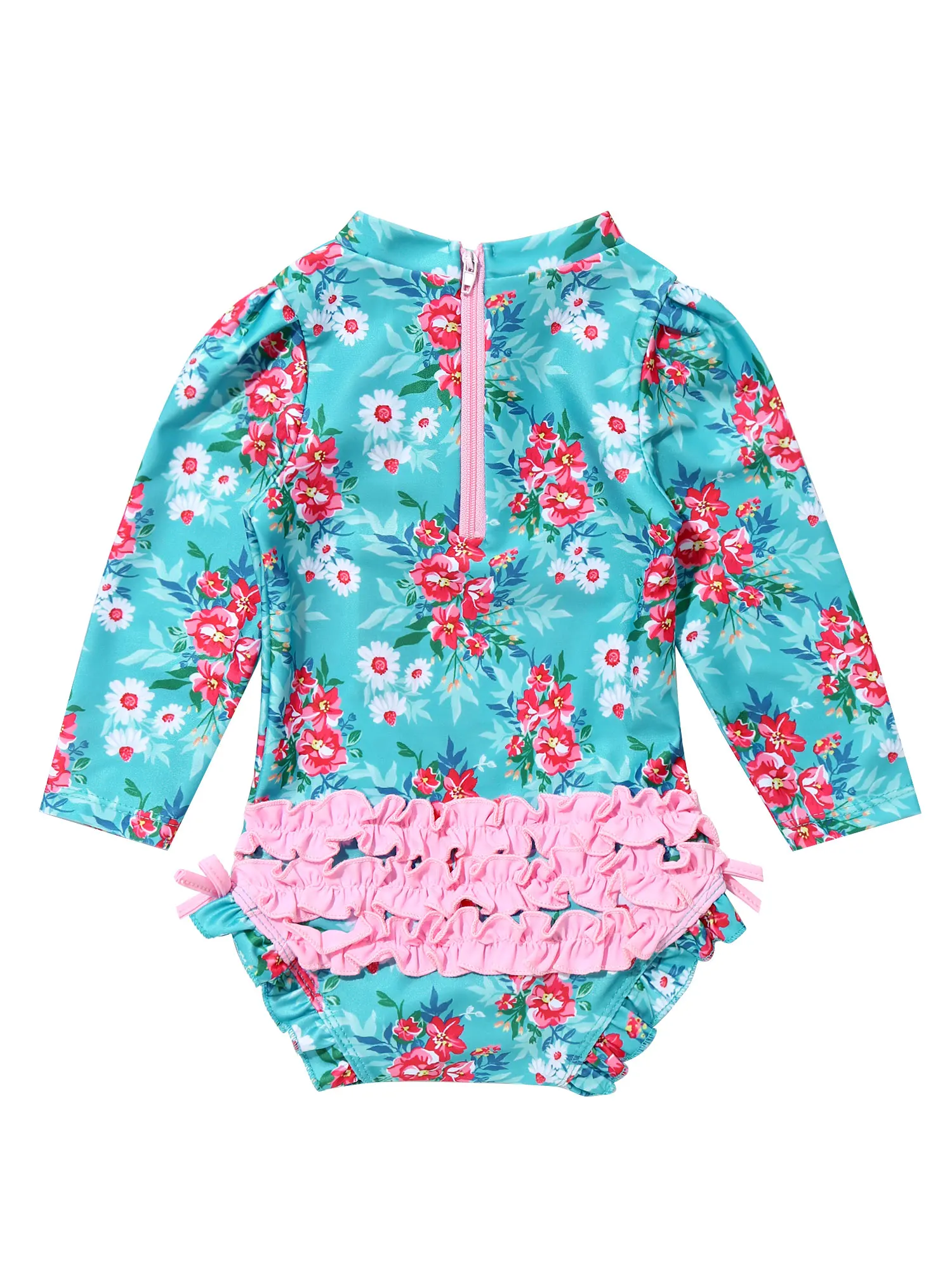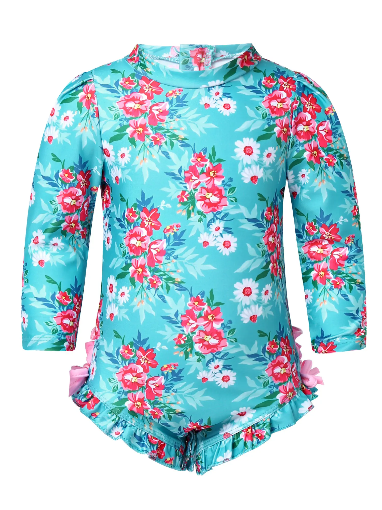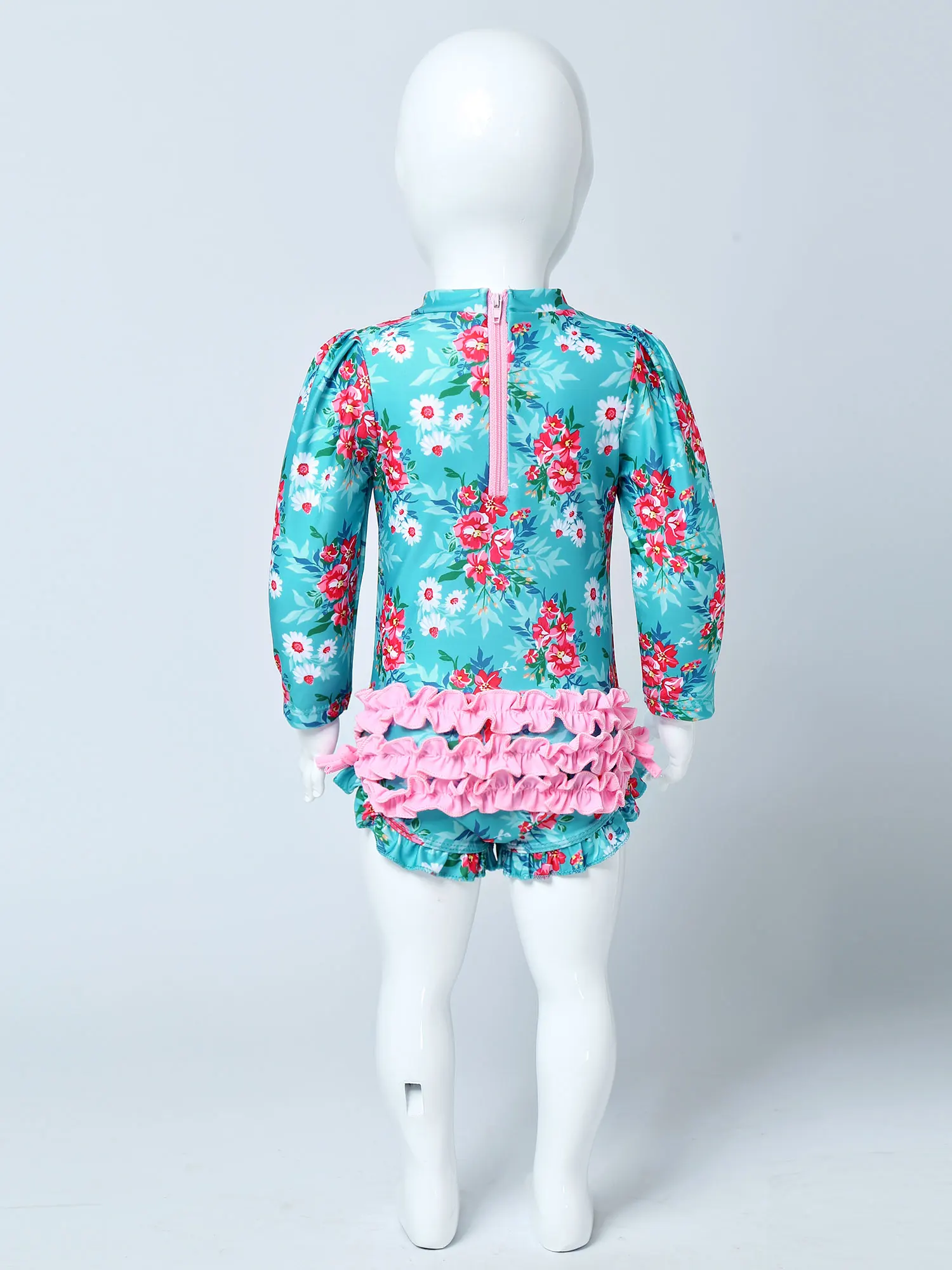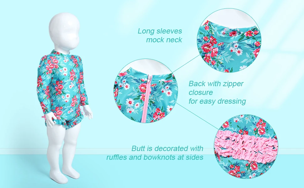Long sleeves, mock neck, allover is printed with floral pattern. Back with zipper closure for easy dressing. Butt is decorated with ruffles and bowknots at sides.