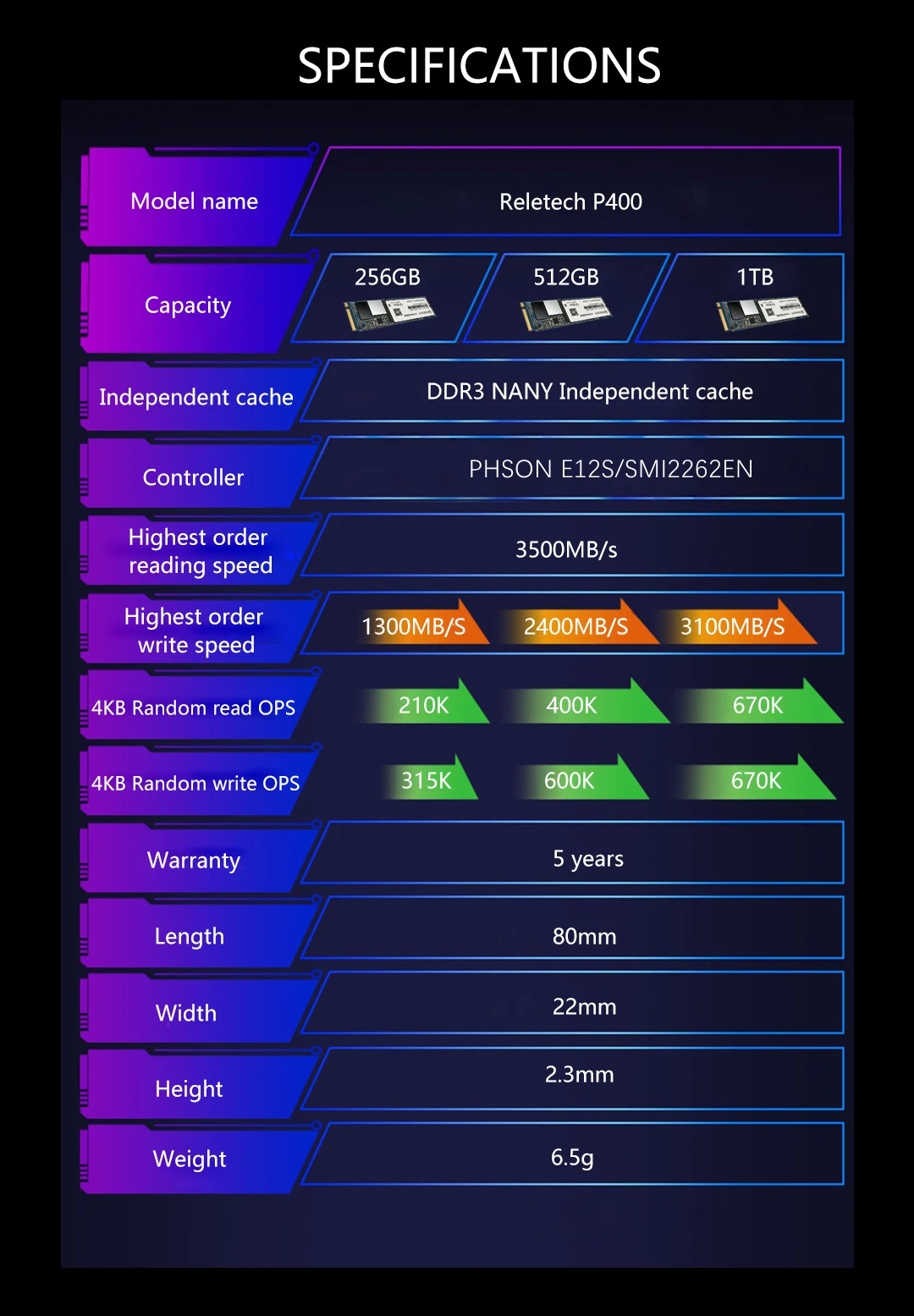 PS: скорость указан только в справочных целях, он SSD скорость будет зависеть от многих факторов, такие как тип интерфейса, компьютерное оборудование, компьютерная система, и система тестирования.