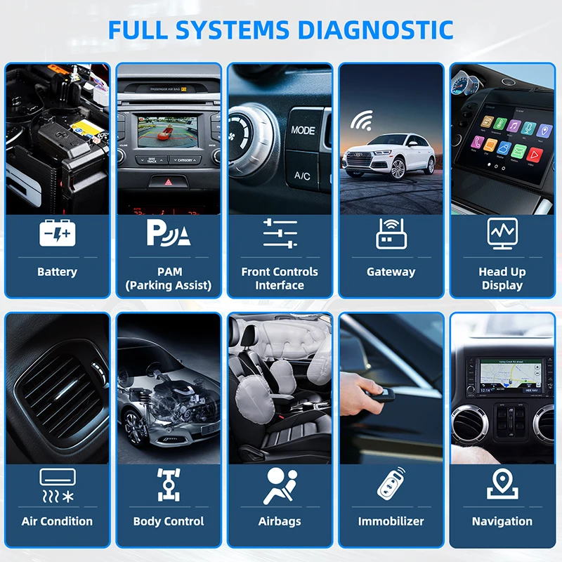 1. [Полная диагностика системы] + [пять специальных функций]: Вы можете использовать его для управления системой двигателя, системой подушки безопасности, системой ABS, системой трансмиссии, тормозной системой, сигнализацией, системой бесключевого входа, система TPMS, колесная система, топливная система и т. Д. Выполнять OBD2 диагноз. Кроме того, вы также можете использовать его для сброса угла поворота руля, дроссельной заслонки, тормозных колодок, масляной лампы, и выполнения соответствия батареи и дроссельной заслонки.